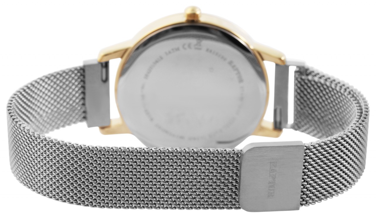 O relógio de pulso feminino analógico de 3 ponteiros da Raptor possui um movimento de quartzo de alta qualidade. A bracelete milanesa tem 14 mm de largura na alça e pode ser aberta e fechada com um prático fecho magnético de aço inoxidável. O comprimento total do relógio é de 25 cm. A caixa de metal com vidro mineral tem um diâmetro de 35 mm e uma altura de 8 mm. O fundo da caixa é feito de aço inoxidável e o relógio tem resistência à água de 3 ATM. O mostrador limpo é claramente projetado e permite que você leia a hora de forma rápida e fácil. Os ponteiros e índices adaptam-se em cores e completam a aparência geral harmoniosa do relógio.