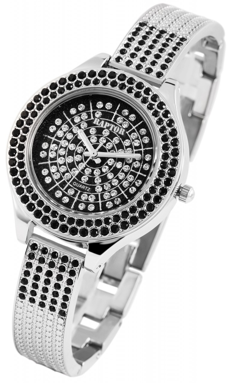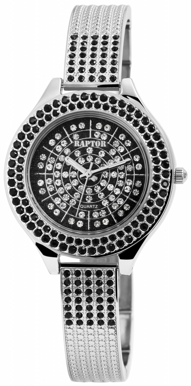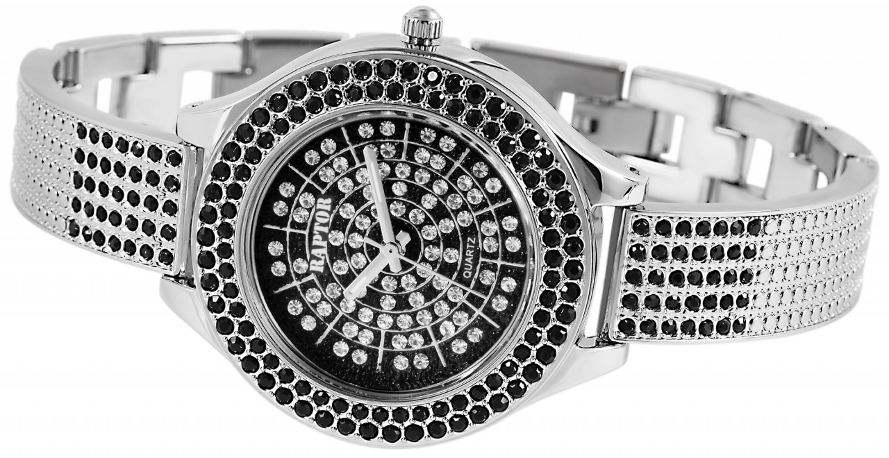 O relógio de pulso feminino analógico de 3 ponteiros da Raptor possui um movimento de quartzo de alta qualidade. A bracelete de metal tem 12 mm de largura na alça e pode ser aberta e fechada com um fecho de clipe. O comprimento total do relógio é de 20 cm. A caixa de metal com vidro mineral tem um diâmetro de 35 mm e uma altura de 10 mm. O fundo da caixa é feito de aço inoxidável. O relógio é o companheiro perfeito para o dia a dia e para ocasiões especiais. Graças ao atraente acabamento de pedras preciosas, que pode ser encontrado na luneta, na bracelete e até no mostrador, ele chama imediatamente a atenção e realça habilmente qualquer roupa, por mais simples que seja. A bracelete é decorada com um total de 20 pedras simili, há 100 strass na luneta e 86 pedras brilhantes adicionais no mostrador.