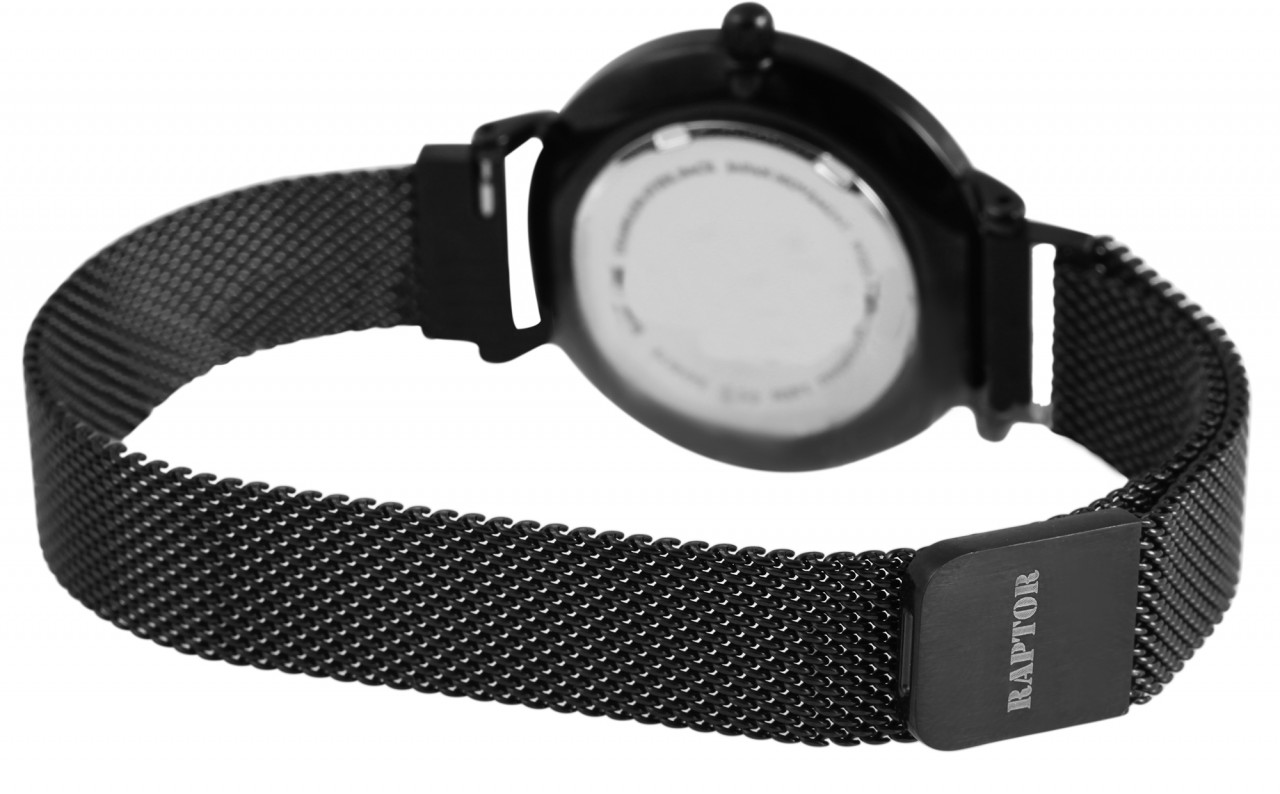 O relógio de pulso analógico feminino da marca Raptor ” Giana” possui movimento de quartzo de alta qualidade. A bracelete tem 14 mm de largura. O comprimento total do relógio é de 25 cm. A caixa de aço inoxidável com vidro mineral tem um diâmetro de 32 mm e uma altura de 8 mm. O fundo da caixa é feito de aço inoxidável e o relógio tem resistência à água de 3 ATM.