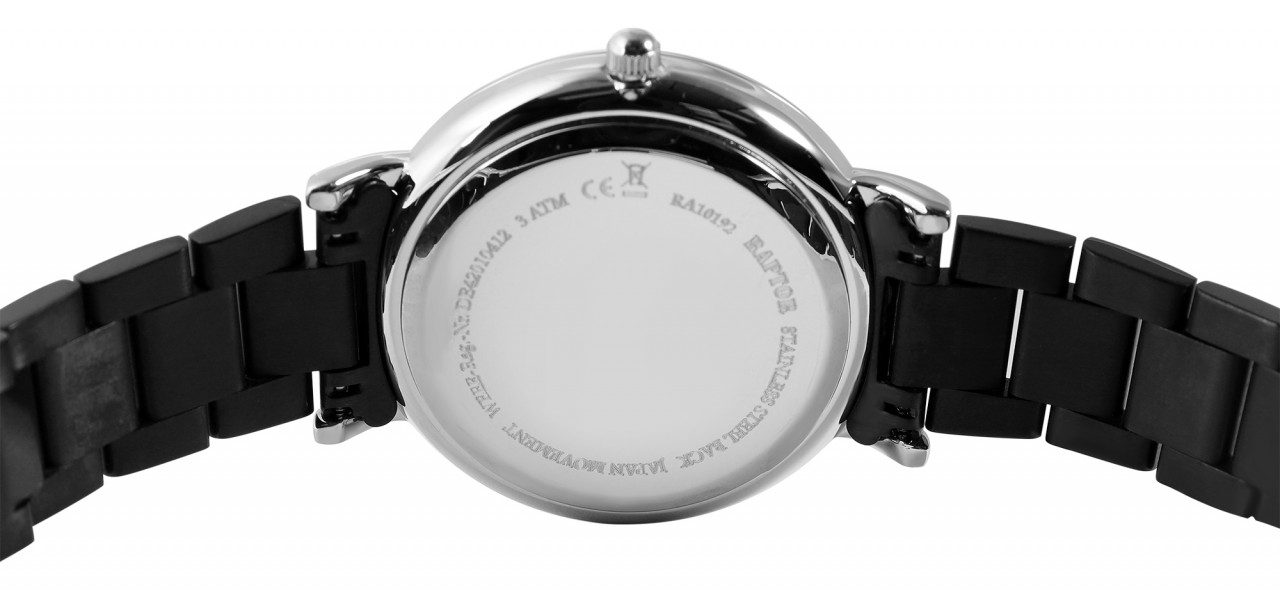 O relógio analógico feminino da marca Raptor “Loryn” possui uma bracelete em aço inoxidável que tem 20 mm de largura e tem um fecho dobrável em aço inoxidável. O comprimento total é de 20.5 cm. A caixa de metal com vidro mineral tem dimensão de 35 mm e altura de caixa de 8 mm. A tampa da caixa é feita de aço inoxidável.