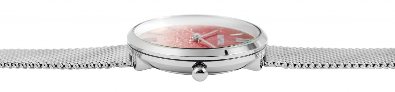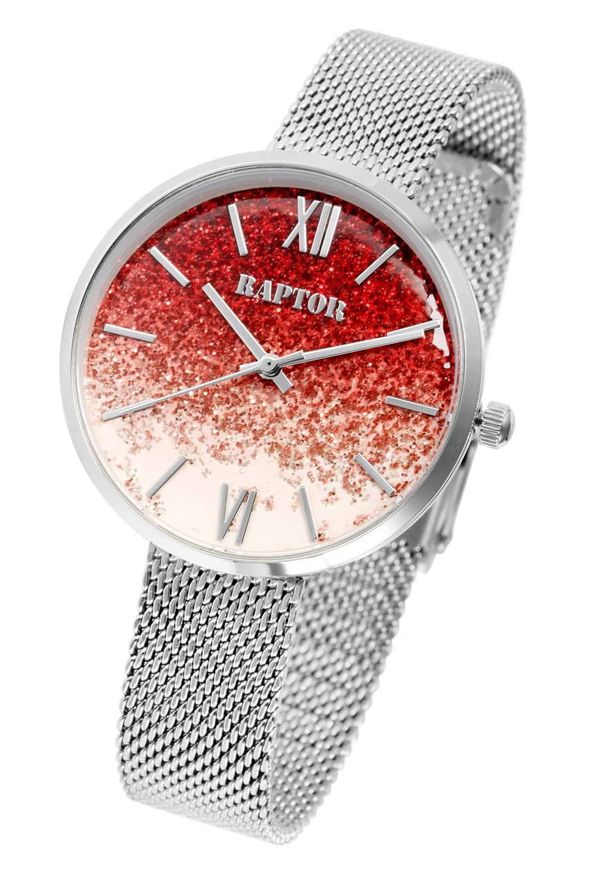 O relógio de pulso feminino analógico de 3 ponteiros da Raptor possui um movimento de quartzo de alta qualidade. A bracelete milanesa de malha fina é feita de aço inoxidável, tem 14 mm de largura na alça e garante conforto de uso. Devido ao fecho de gancho ajustável com barra de segurança, o comprimento do relógio pode ser ajustado individualmente a qualquer pulso. O comprimento total é de 21,5 cm. A caixa de aço inoxidável com vidro mineral tem um diâmetro de 36 mm e uma altura de 8 mm. Neste modelo de relógio, o destaque está no mostrador cravejado de glitter. Isso habilmente se destaca e atrai inúmeros olhares. A divisão do mostrador é simples, os ponteiros e os índices combinam com a cor da caixa e, assim, completam harmoniosamente o quadro geral.