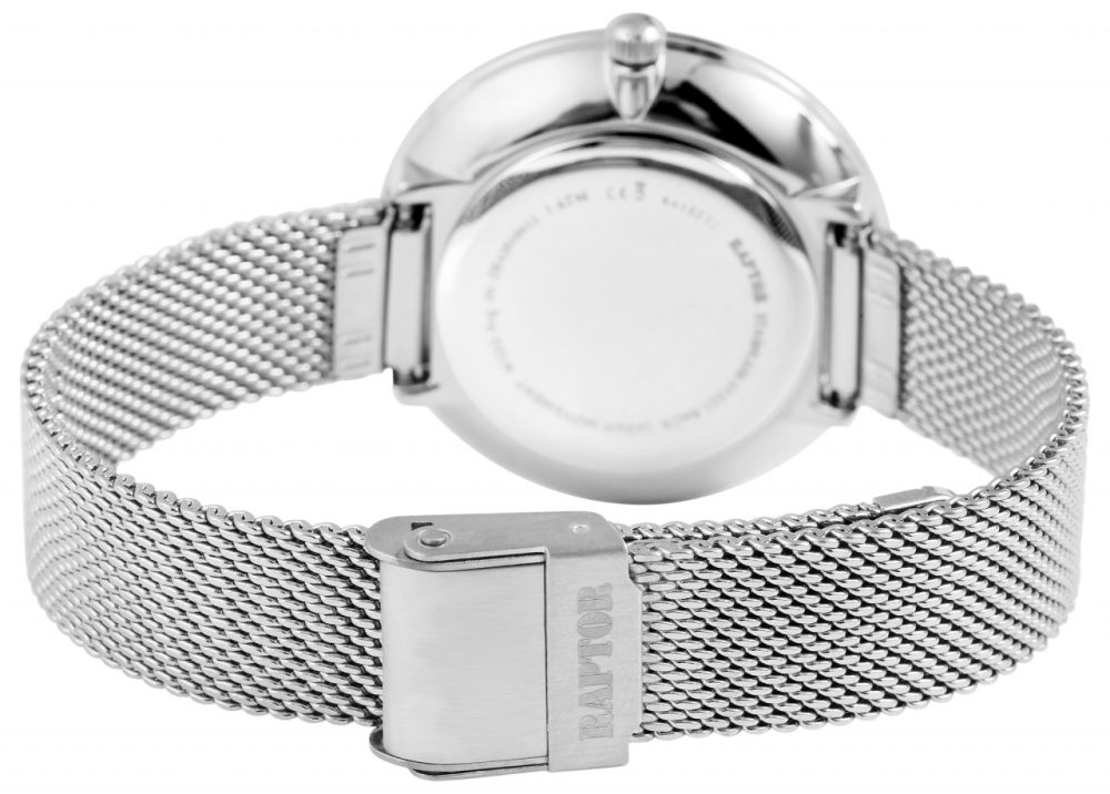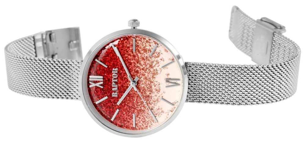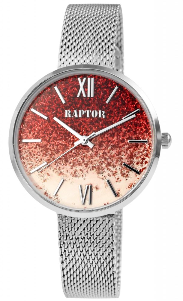 O relógio de pulso feminino analógico de 3 ponteiros da Raptor possui um movimento de quartzo de alta qualidade. A bracelete milanesa de malha fina é feita de aço inoxidável, tem 14 mm de largura na alça e garante conforto de uso. Devido ao fecho de gancho ajustável com barra de segurança, o comprimento do relógio pode ser ajustado individualmente a qualquer pulso. O comprimento total é de 21,5 cm. A caixa de aço inoxidável com vidro mineral tem um diâmetro de 36 mm e uma altura de 8 mm. Neste modelo de relógio, o destaque está no mostrador cravejado de glitter. Isso habilmente se destaca e atrai inúmeros olhares. A divisão do mostrador é simples, os ponteiros e os índices combinam com a cor da caixa e, assim, completam harmoniosamente o quadro geral.