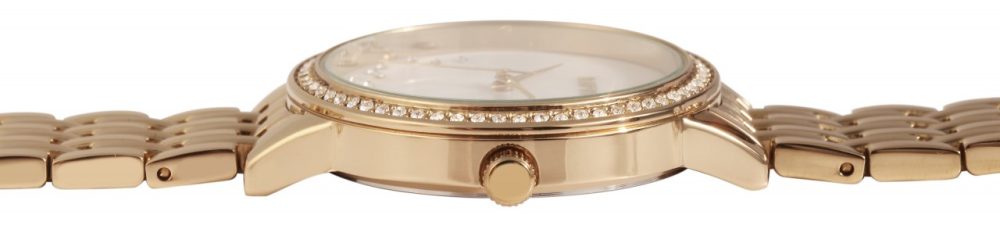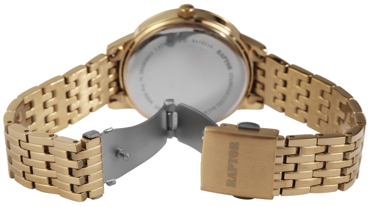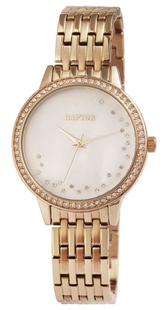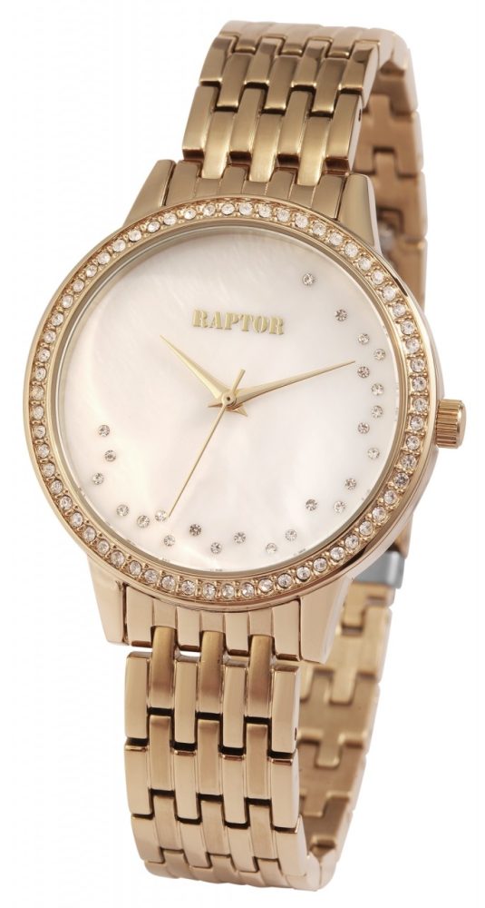 O relógio de pulso feminino analógico de 3 ponteiros da Raptor possui um movimento de quartzo de alta qualidade. A bracelete de aço inoxidável tem 16 mm de largura na alça e pode ser aberta e fechada com um fecho dobrável. O comprimento total do relógio é de 22 cm, mas pode ser ajustado conforme desejado graças aos elementos removíveis. O diâmetro da caixa é de 38 mm, a altura da caixa é de 9 mm. A tampa da caixa também é feita de aço inoxidável. O relógio também possui resistência à água de 3 ATM. A bracelete de aço inoxidável brilhante forma uma transição tranquila para a caixa do relógio e completa assim o quadro geral. Outra particularidade é a luneta decorada com pedras simil e os detalhes do mostrador. Os ponteiros e índices correspondem à cor da caixa do relógio.