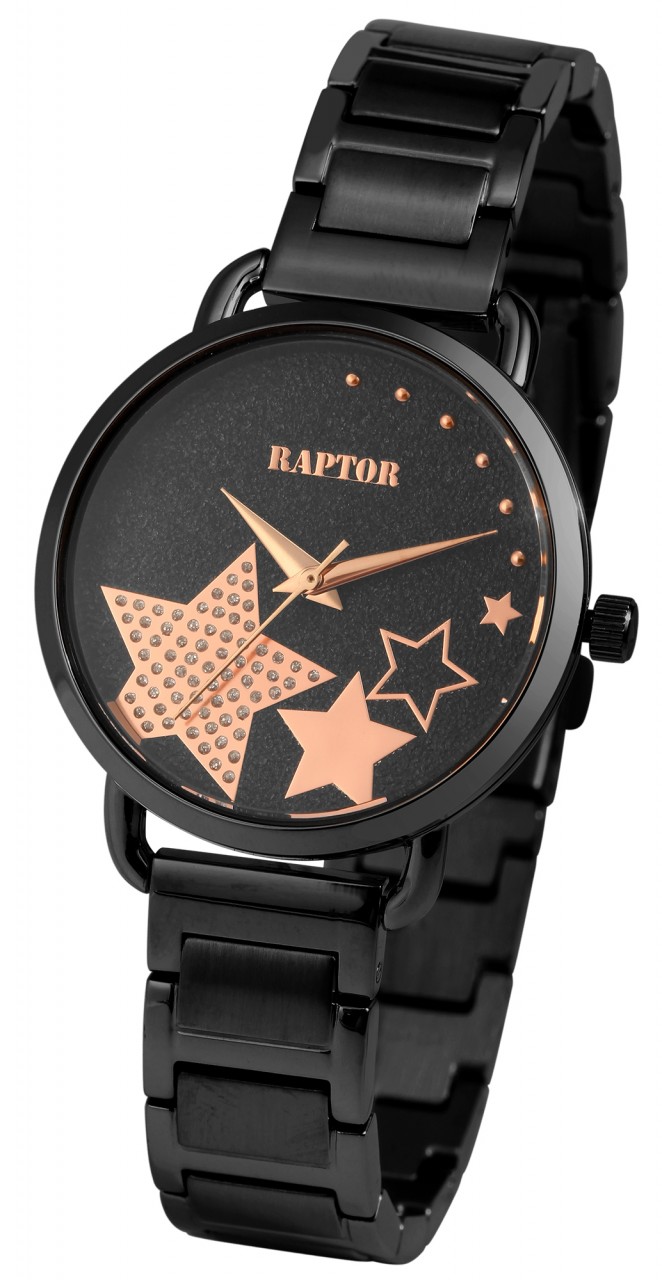 O relógio de pulso feminino analógico de 3 ponteiros da Raptor possui um movimento de quartzo de alta qualidade. A bracelete em aço inoxidável tem 14 mm de largura nas alças e pode ser aberta e fechada com um fecho dobrável em aço inoxidável. O comprimento total do relógio é de 20 cm. A caixa de aço inoxidável com vidro mineral tem um diâmetro de 33 mm e uma altura de 8,5 mm. O fundo da caixa é feito de aço inoxidável. O relógio também possui resistência à água de 3 ATM. Quando se trata de relógios femininos, o foco está no mostrador. Isso se destaca habilmente graças aos motivos das estrelas e faz brilhar cada pulso.