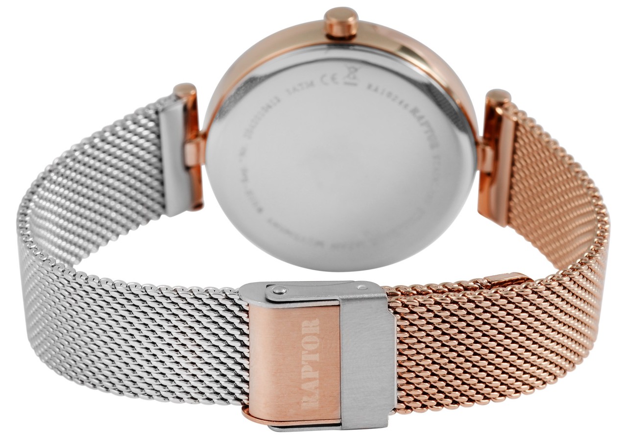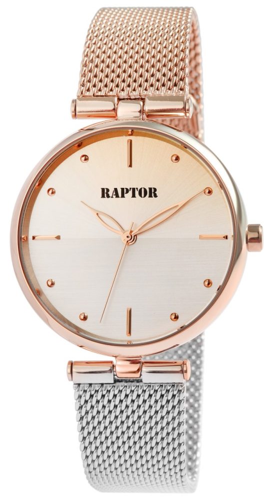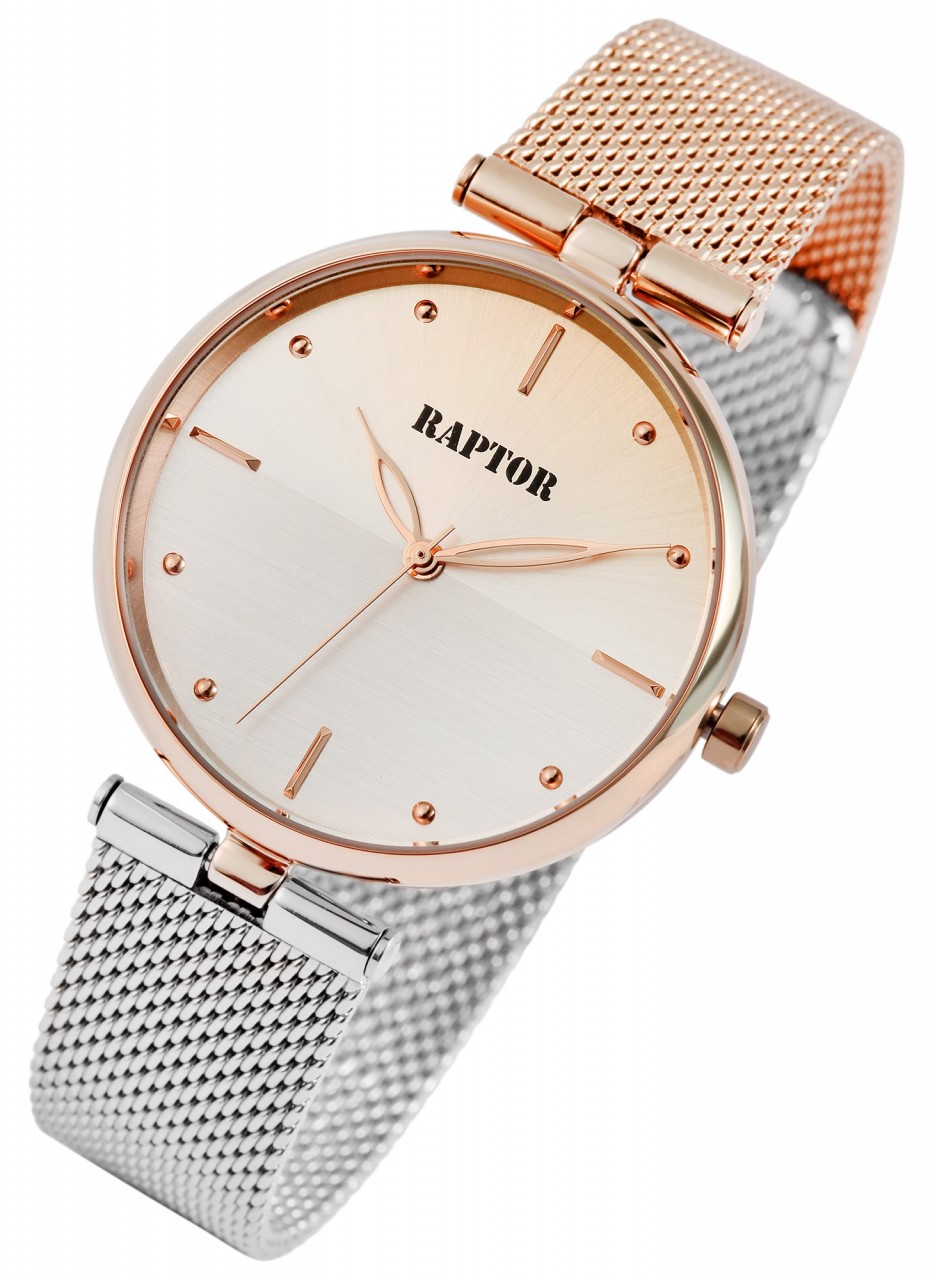 O relógio de pulso analógico de 3 ponteiros para senhora da marca Raptor possui um movimento de quartzo de alta qualidade. A bracelete milanesa é feita de aço inoxidável e tem uma largura de 18 mm. O relógio de 21 cm de comprimento pode ser aberto e fechado com um fecho de gancho com um fecho de segurança integrado. A caixa metálica com vidro mineral tem um diâmetro de 34 mm e uma altura de 9 mm. O fundo da caixa é feito de aço inoxidável e o relógio tem uma resistência à água de 3 bar. Um destaque visual é o mostrador, que tem um acabamento mate e um acabamento brilhante. Os hemisférios em filigrana servem de índices de pontos e completam harmoniosamente o aspeto geral. Estas características especiais fazem deste relógio de pulso da moda um must-have absoluto que não pode faltar em nenhuma coleção de relógios.