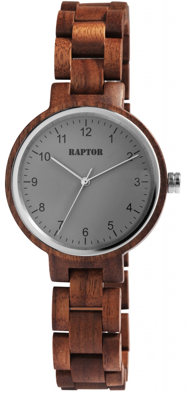 O relógio de pulso feminino analógico de 3 ponteiros da marca Raptor possui o movimento de quartzo Miyota V321 de alta qualidade. A pulseira de madeira tem 8 mm de largura na alça e pode ser aberta e fechada com um fecho dobrável em aço inoxidável. A largura total da pulseira é de 17 mm e o comprimento total do relógio é de 23,5 cm. A caixa de madeira com vidro mineral tem um diâmetro de 38 mm e uma altura de 10 mm. O fundo da caixa também é feito de madeira. Um destaque visual é a borda espelhada de 1 mm de largura no vidro mineral. Os ponteiros são feitos na mesma cor da borda do espelho e juntos conferem ao relógio um visual especial e elegante. Com o relógio de madeira Raptor você tem um atrativo absoluto em seu pulso que pode ser combinado para qualquer ocasião. Graças ao material leve, adapta-se perfeitamente ao pulso e é confortável de usar.