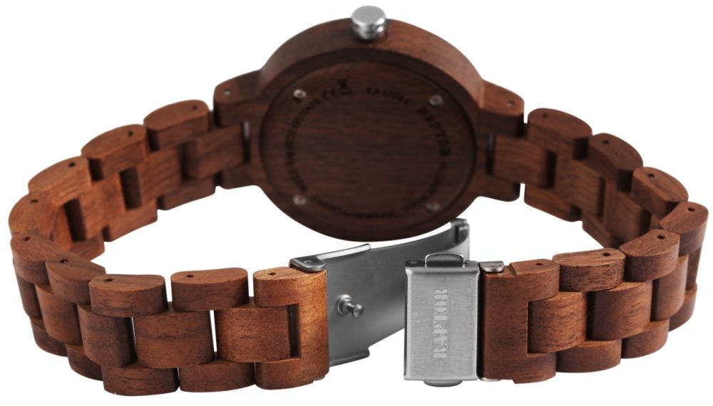 O relógio de pulso feminino analógico de 3 ponteiros da marca Raptor possui o movimento de quartzo Miyota V321 de alta qualidade. A pulseira de madeira tem 8 mm de largura na alça e pode ser aberta e fechada com um fecho dobrável em aço inoxidável. A largura total da pulseira é de 17 mm e o comprimento total do relógio é de 23,5 cm. A caixa de madeira com vidro mineral tem um diâmetro de 38 mm e uma altura de 10 mm. O fundo da caixa também é feito de madeira. Um destaque visual é a borda espelhada de 1 mm de largura no vidro mineral. Os ponteiros são feitos na mesma cor da borda do…