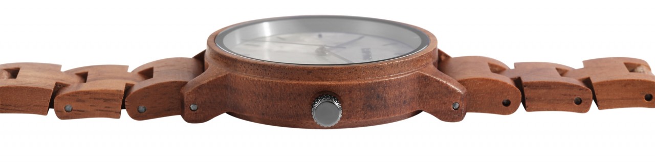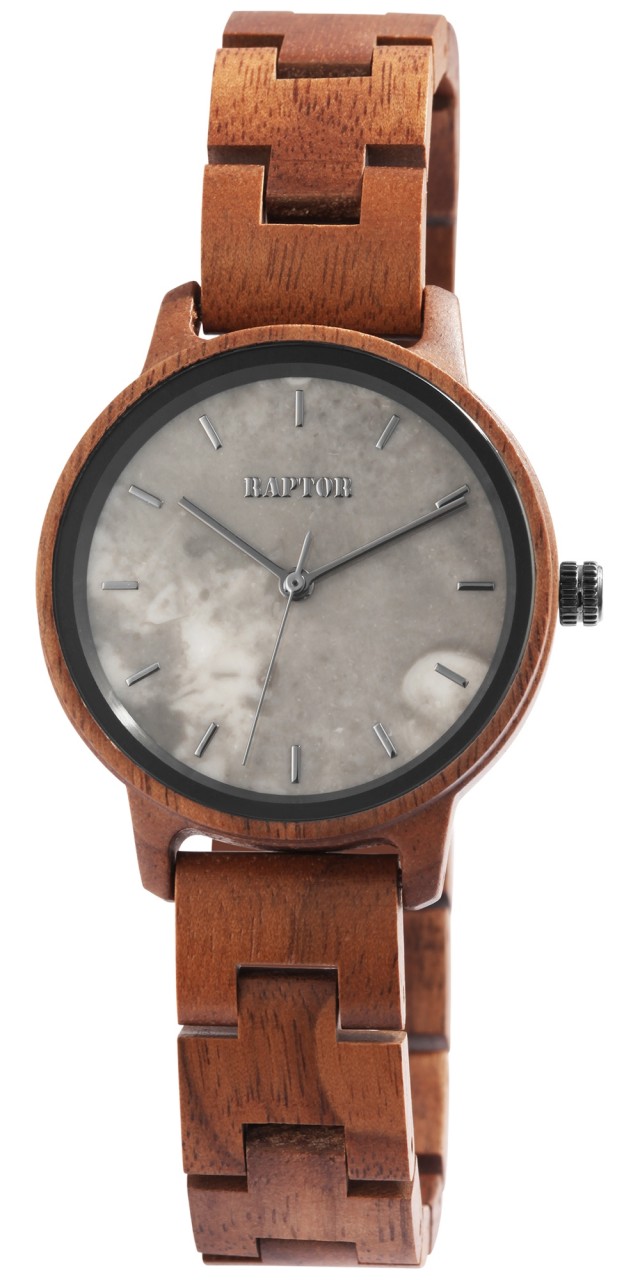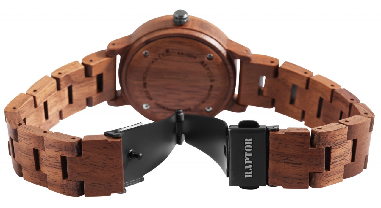 O relógio de pulso feminino analógico de 3 ponteiros da marca Raptor possui o movimento de quartzo Miyota GL30 de alta qualidade. A bracelete de madeira tem 16 mm de largura na alça e pode ser aberta e fechada com um fecho dobrável em aço inoxidável. O comprimento total do relógio é de 22 cm. A caixa de madeira com vidro mineral tem um diâmetro de 36 mm e uma altura de 11 mm. O fundo da caixa também é feito de madeira. Um destaque visual é a borda espelhada de 1 mm de largura no vidro mineral. Os ponteiros são feitos na mesma cor da borda do espelho e juntos conferem ao relógio um visual especial e elegante. Com o relógio de madeira Raptor você tem um atrativo absoluto em seu pulso que pode ser combinado para qualquer ocasião. Graças ao material leve, adapta-se perfeitamente ao pulso para obter um conforto de utilização fantástico.