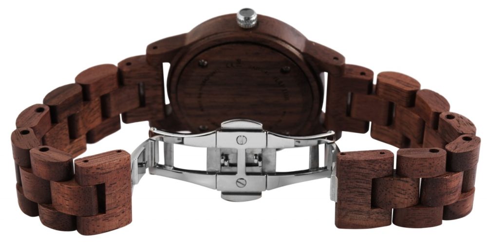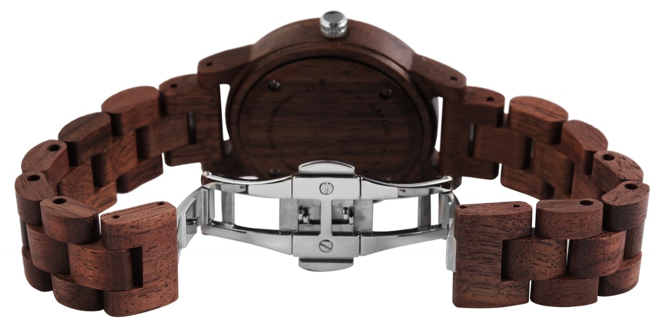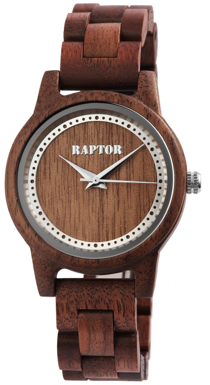 O relógio de pulso feminino analógico de 3 ponteiros da marca Raptor possui o movimento de quartzo de alta qualidade Miyota 2035. A bracelete de madeira tem 16 mm de largura na alça e pode ser aberta e fechada usando um fecho dobrável em forma de borboleta de aço inoxidável prateado. O comprimento total do relógio é de 19 cm. A caixa de madeira com vidro mineral tem um diâmetro de 37 mm e uma altura de 11 mm. O fundo da caixa também é feito de madeira. Um destaque visual é a borda espelhada de 1 mm de largura no vidro mineral. Os ponteiros são feitos na mesma cor da borda do espelho e juntos conferem ao relógio um visual especial e elegante. Com o relógio de madeira Raptor você tem um atrativo absoluto em seu pulso que pode ser combinado para qualquer ocasião. Graças ao material leve, adapta-se perfeitamente ao pulso e é confortável de usar.