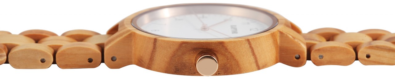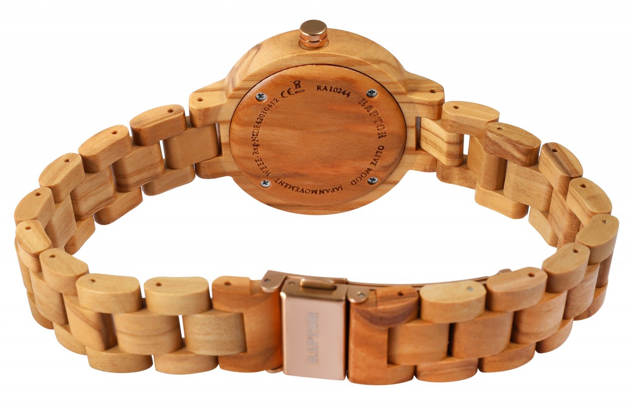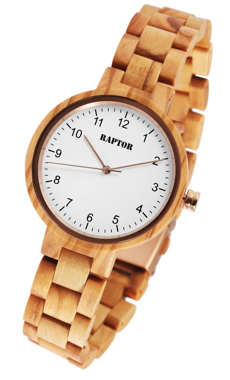 O relógio de pulso feminino analógico de 3 ponteiros da marca Raptor possui o movimento de quartzo Miyota V321 de alta qualidade. A bracelete de madeira tem 8 mm de largura na alça e pode ser aberta e fechada com um fecho dobrável em aço inoxidável. A largura total da pulseira é de 17 mm e o comprimento total do relógio é de 23,5 cm. A caixa de madeira com vidro mineral tem um diâmetro de 38 mm e uma altura de 10 mm. O fundo da caixa também é feito de madeira. Um destaque visual é a borda espelhada de 1 mm de largura no vidro mineral. Os ponteiros são feitos na mesma cor da borda do espelho e juntos conferem ao relógio um visual especial e elegante. Com o relógio de madeira Raptor você tem um atrativo absoluto em seu pulso que pode ser combinado para qualquer ocasião.