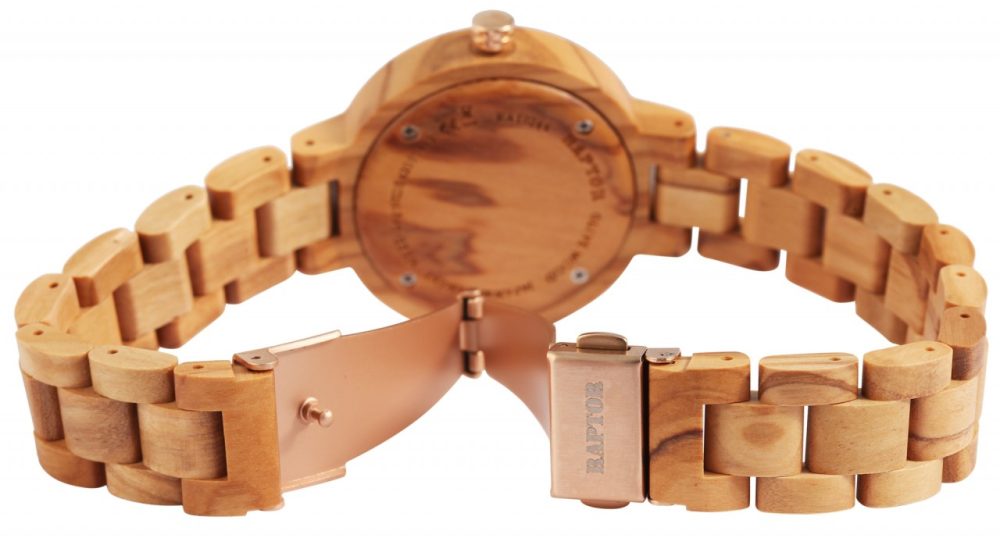 O relógio de pulso feminino analógico de 3 ponteiros da marca Raptor possui o movimento de quartzo Miyota V321 de alta qualidade. A bracelete de madeira tem 8 mm de largura na alça e pode ser aberta e fechada com um fecho dobrável em aço inoxidável. A largura total da pulseira é de 17 mm e o comprimento total do relógio é de 23,5 cm. A caixa de madeira com vidro mineral tem um diâmetro de 38 mm e uma altura de 10 mm. O fundo da caixa também é feito de madeira. Um destaque visual é a borda espelhada de 1 mm de largura no vidro mineral. Os ponteiros são feitos na mesma cor da borda do espelho e juntos conferem ao relógio um visual especial e elegante. Com o relógio de madeira Raptor você tem um atrativo absoluto em seu pulso que pode ser combinado para qualquer ocasião.