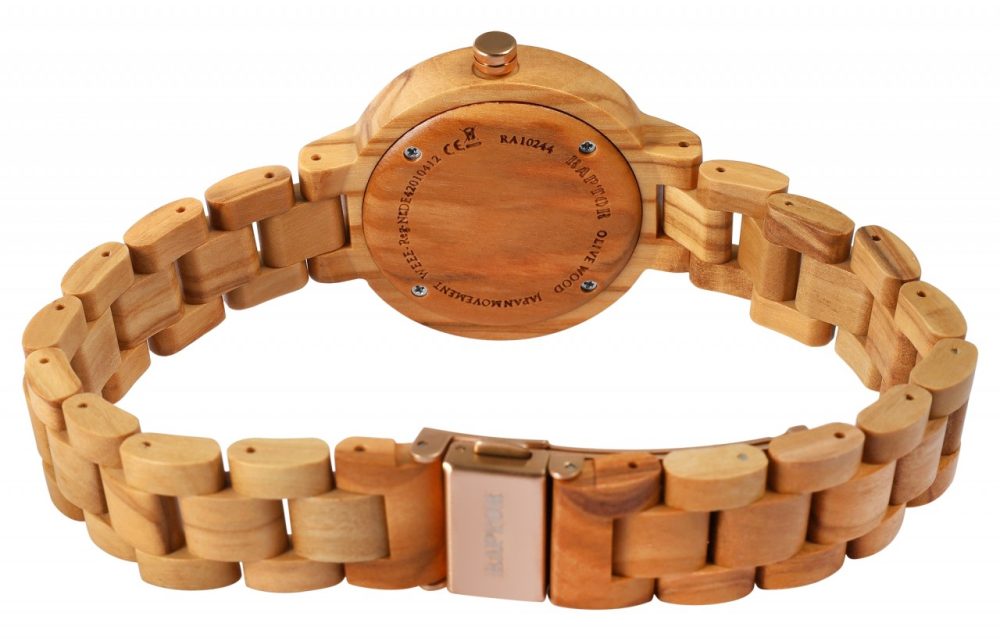 O relógio de pulso feminino analógico de 3 ponteiros da marca Raptor possui o movimento de quartzo Miyota V321 de alta qualidade. A bracelete de madeira tem 8 mm de largura na alça e pode ser aberta e fechada com um fecho dobrável em aço inoxidável. A largura total da pulseira é de 17 mm e o comprimento total do relógio é de 23,5 cm. A caixa de madeira com vidro mineral tem um diâmetro de 38 mm e uma altura de 10 mm. O fundo da caixa também é feito de madeira. Um destaque visual é a borda espelhada de 1 mm de largura no…
