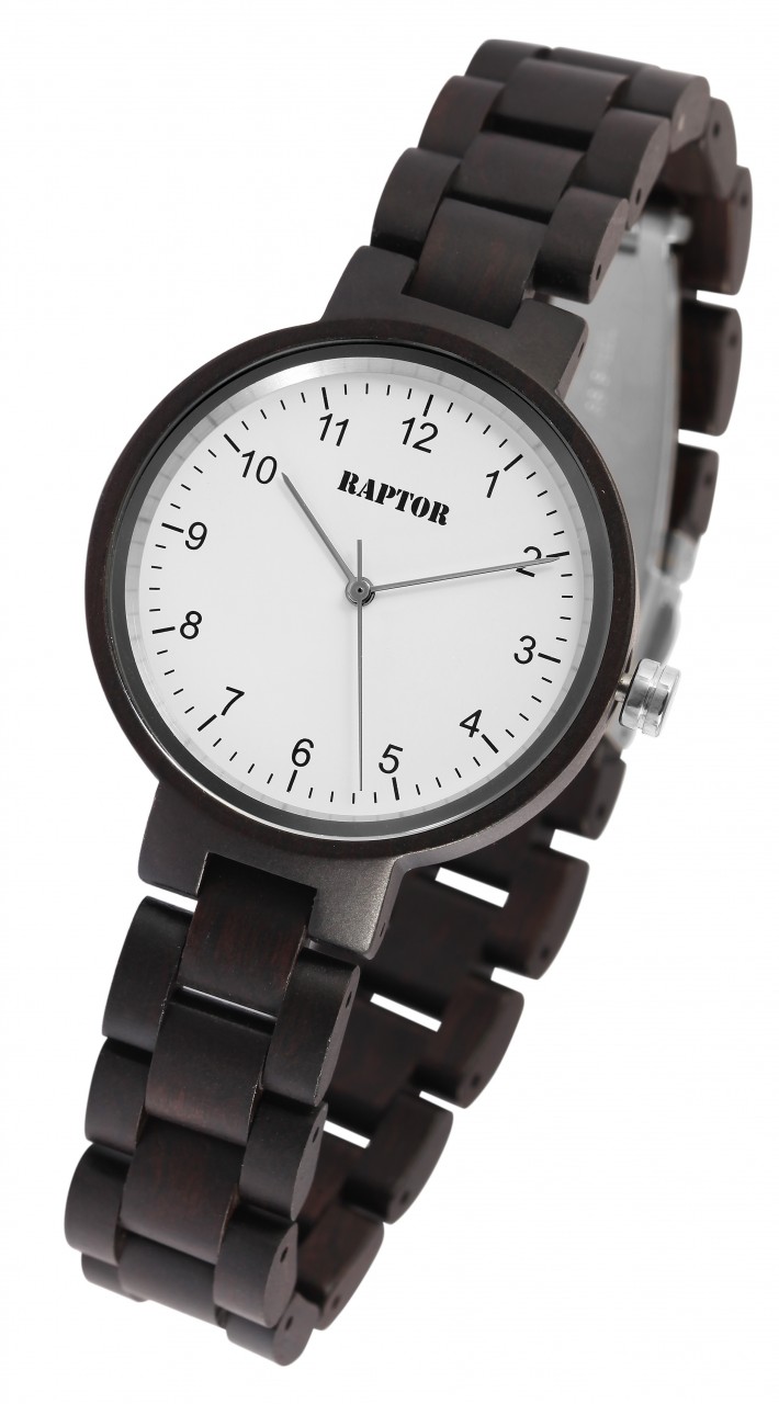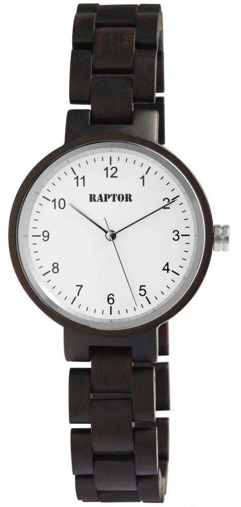 O relógio de pulso feminino analógico de 3 ponteiros da marca Raptor possui o movimento de quartzo Miyota V321 de alta qualidade. A bracelete de madeira tem 8 mm de largura na alça e pode ser aberta e fechada com um fecho dobrável em aço inoxidável. A largura total da pulseira é de 17 mm e o comprimento total do relógio é de 23,5 cm. A caixa de madeira com vidro mineral tem um diâmetro de 38 mm e uma altura de 10 mm. O fundo da caixa também é feito de madeira. Um destaque visual é a borda espelhada de 1 mm de largura no vidro mineral. Os ponteiros são feitos na mesma cor da borda do espelho e juntos conferem ao relógio um visual especial e elegante. Com o relógio de madeira Raptor você tem um atrativo absoluto em seu pulso que pode ser combinado para qualquer ocasião.