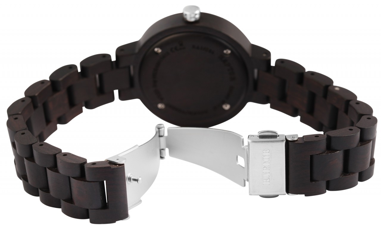 O relógio de pulso feminino analógico de 3 ponteiros da marca Raptor possui o movimento de quartzo Miyota V321 de alta qualidade. A bracelete de madeira tem 8 mm de largura na alça e pode ser aberta e fechada com um fecho dobrável em aço inoxidável. A largura total da pulseira é de 17 mm e o comprimento total do relógio é de 23,5 cm. A caixa de madeira com vidro mineral tem um diâmetro de 38 mm e uma altura de 10 mm. O fundo da caixa também é feito de madeira. Um destaque visual é a borda espelhada de 1 mm de largura no…