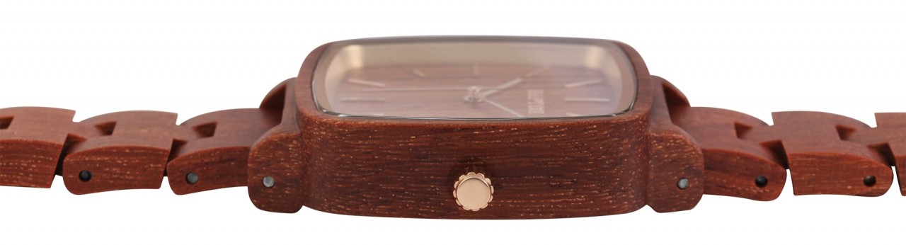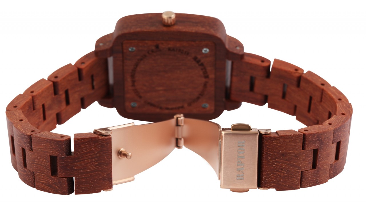 Relógio analógico de pulso para mulher, da marca Raptor “Angry”. Bracelete feita em madeira com 16mm de largura, e um fecho dobrável em aço inoxidável. Tem um movimento de quartzo de alta qualidade, Miyota 2035. Comprimento total do relógio em 22.5 cm.