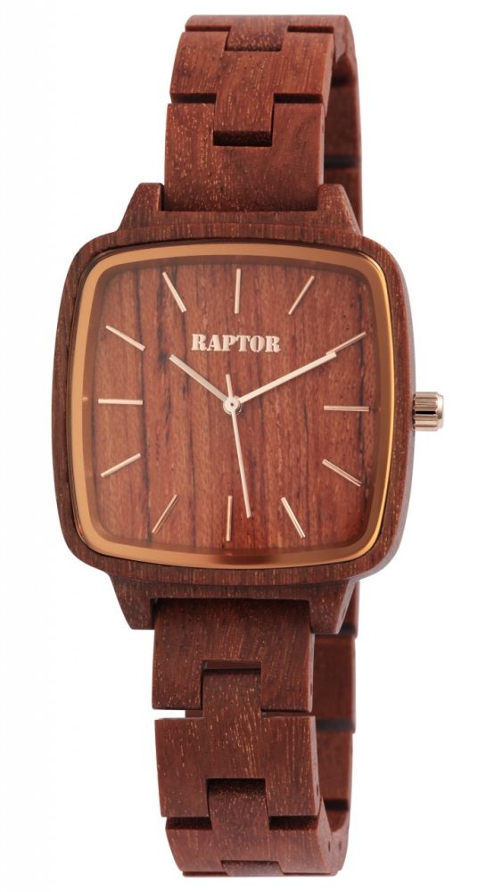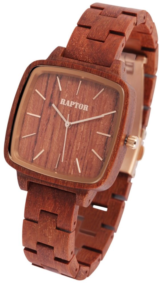 Relógio analógico de pulso para mulher, da marca Raptor “Angry”. Bracelete feita em madeira com 16mm de largura, e um fecho dobrável em aço inoxidável. Tem um movimento de quartzo de alta qualidade, Miyota 2035. Comprimento total do relógio em 22.5 cm.