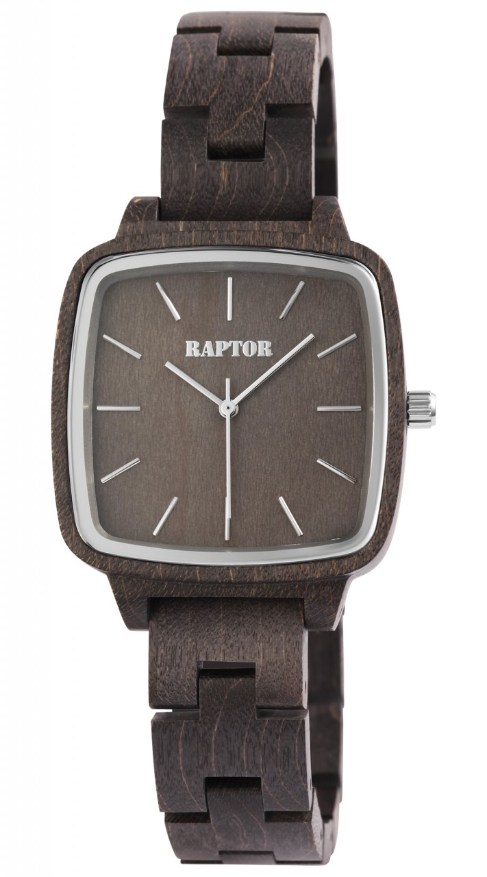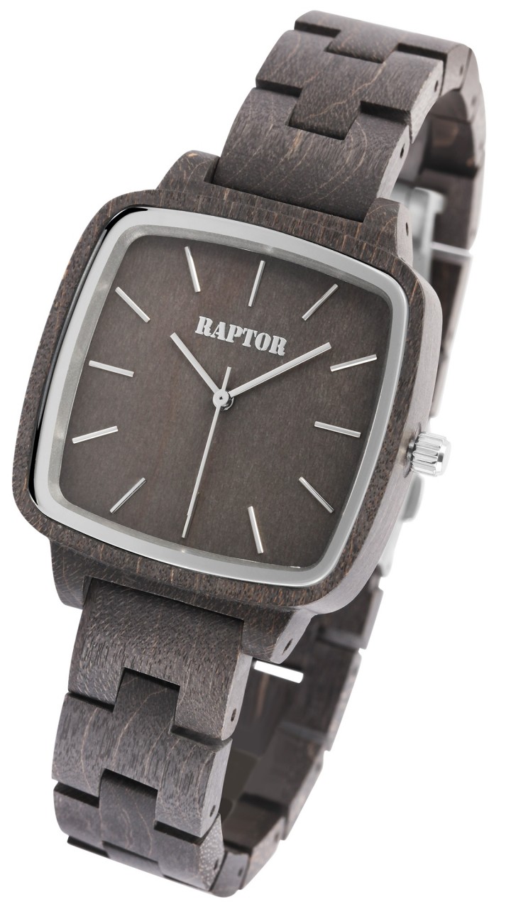 Relógio analógico de pulso para mulher, da marca Raptor “Angry”. Bracelete feita em madeira com 16mm de largura, e um fecho dobrável em aço inoxidável. Tem um movimento de quartzo de alta qualidade, Miyota 2035. Comprimento total do relógio em 22.5 cm.