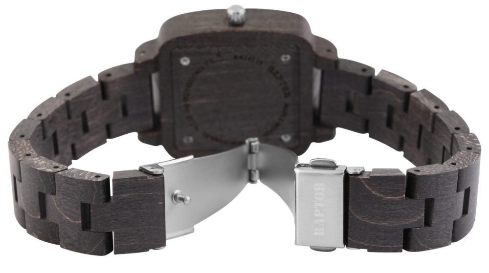 Relógio analógico de pulso para mulher, da marca Raptor “Angry”. Bracelete feita em madeira com 16mm de largura, e um fecho dobrável em aço inoxidável. Tem um movimento de quartzo de alta qualidade, Miyota 2035. Comprimento total do relógio em 22.5 cm.