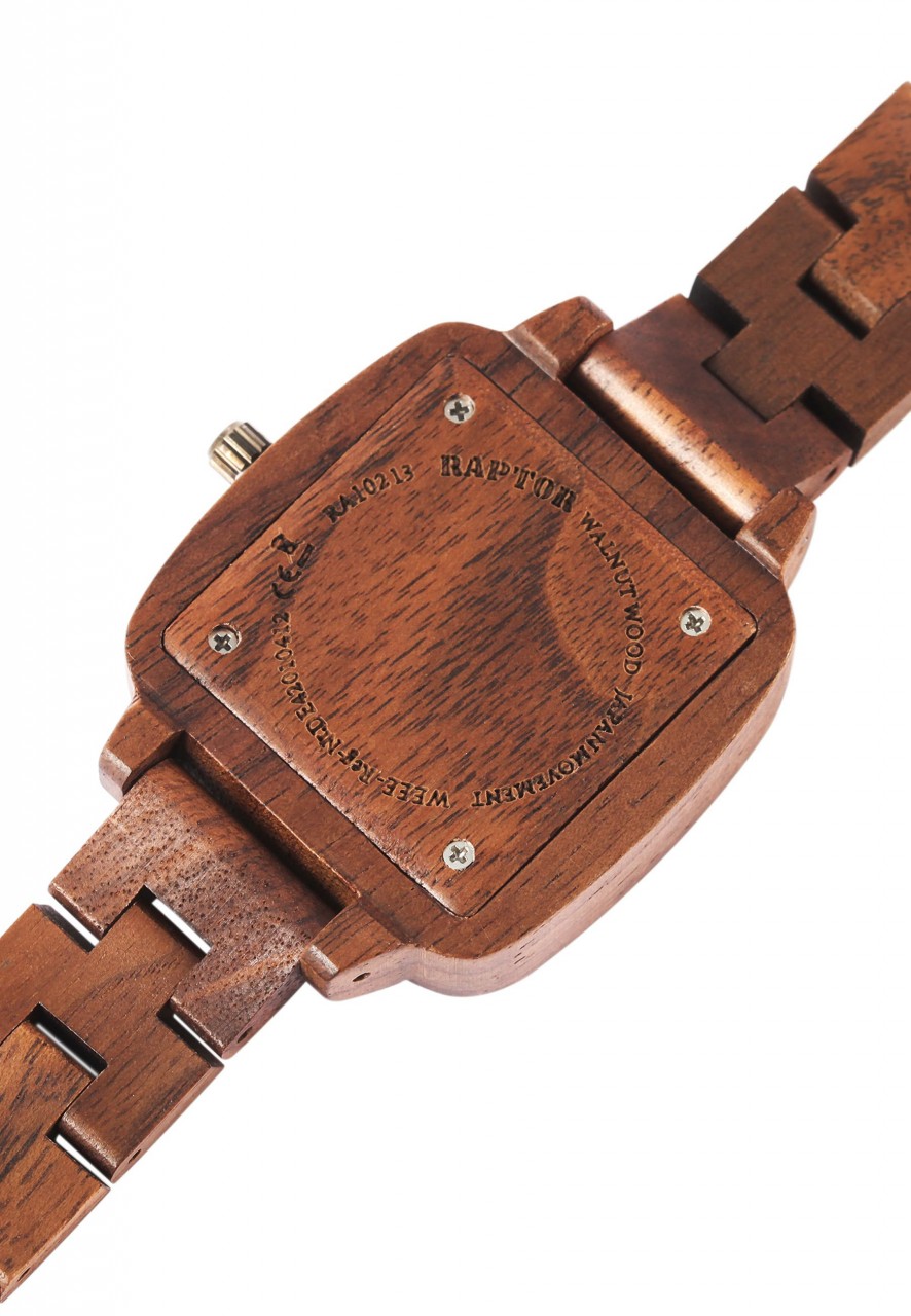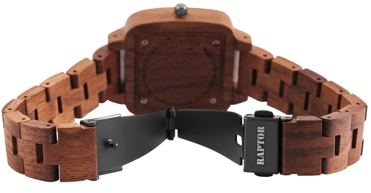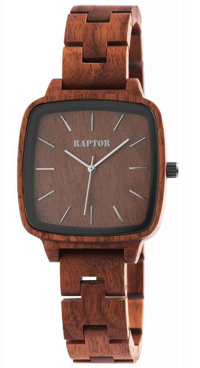 Relógio analógico de pulso para mulher, da marca Raptor “Angry”. Bracelete feita em madeira com 16mm de largura, e um fecho dobrável em aço inoxidável. Tem um movimento de quartzo de alta qualidade, Miyota 2035. Comprimento total do relógio em 22.5 cm.