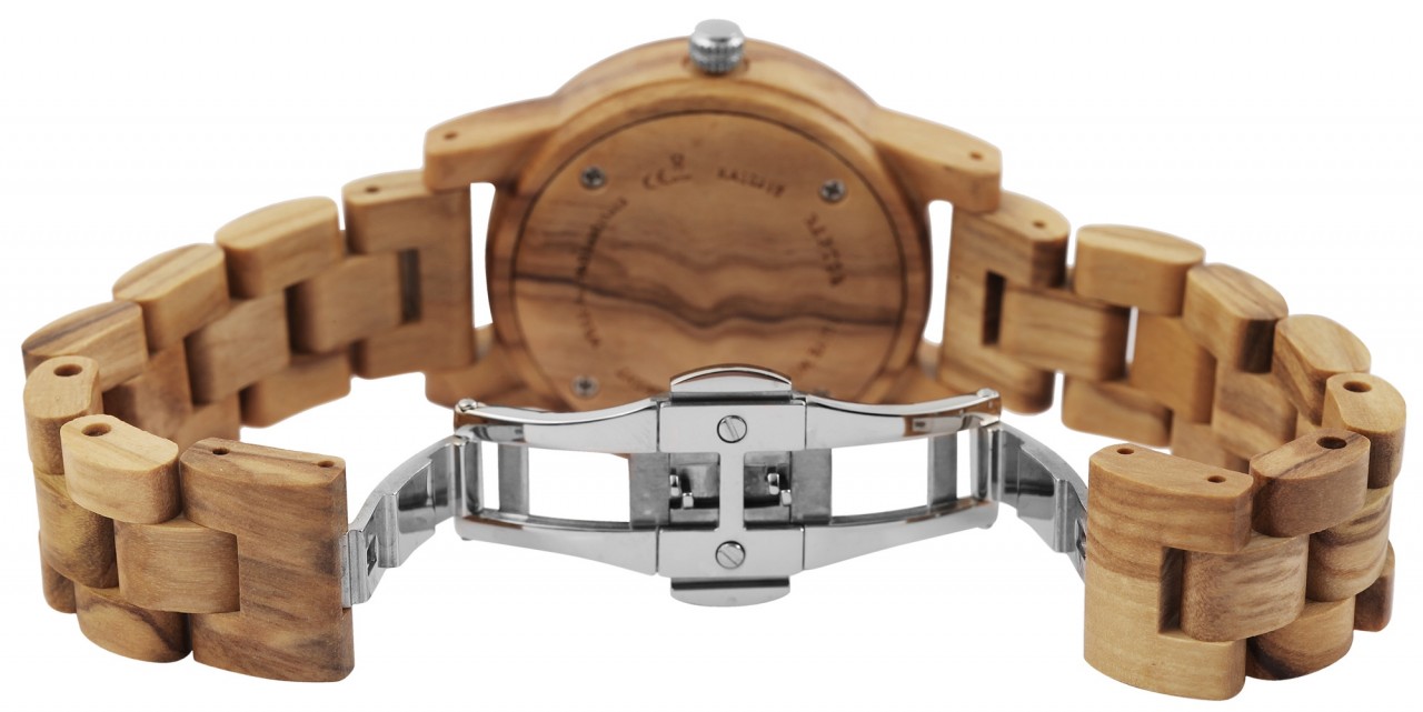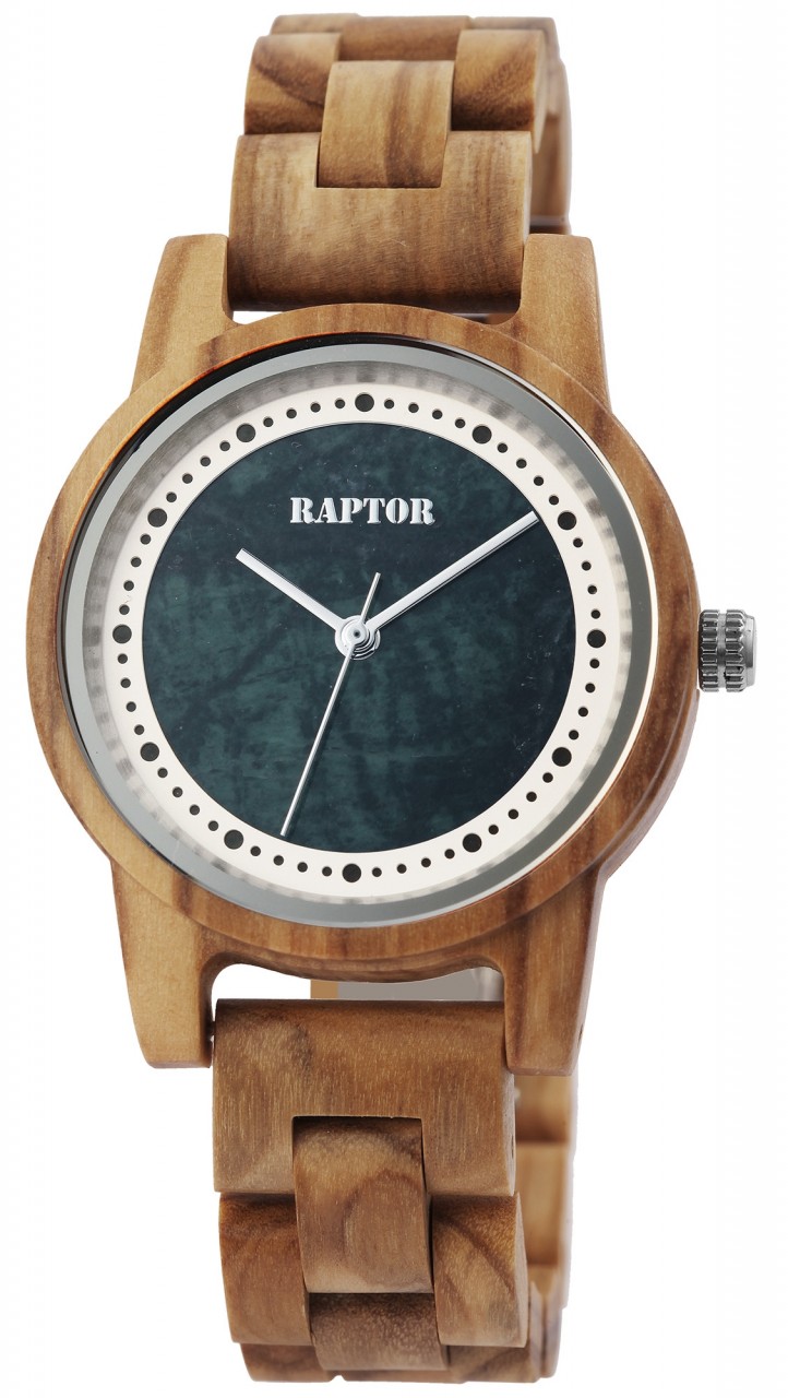 O relógio de pulso feminino analógico de 3 ponteiros da marca Raptor possui o movimento de quartzo de alta qualidade Miyota GL 30. A pulseira de madeira tem 16 mm de largura na alça e pode ser aberta e fechada usando um fecho dobrável em forma de borboleta de aço inoxidável. O comprimento total do relógio é de 19 cm. A caixa de madeira com vidro mineral tem um diâmetro de 36 mm e uma altura de 11 mm. O fundo da caixa também é feito de madeira. Um destaque visual é a borda espelhada de 1 mm de largura no vidro mineral. Isto, em combinação com os ponteiros do relógio, confere-lhe uma aparência especial e elegante. Graças ao material leve, adapta-se perfeitamente ao pulso e é confortável de usar.