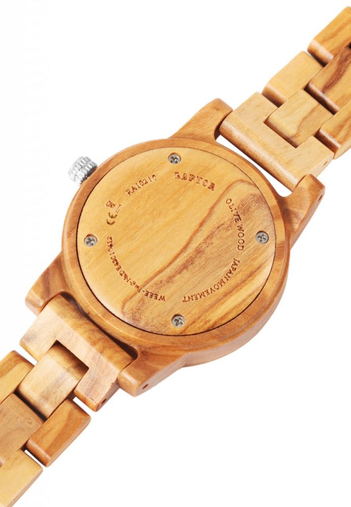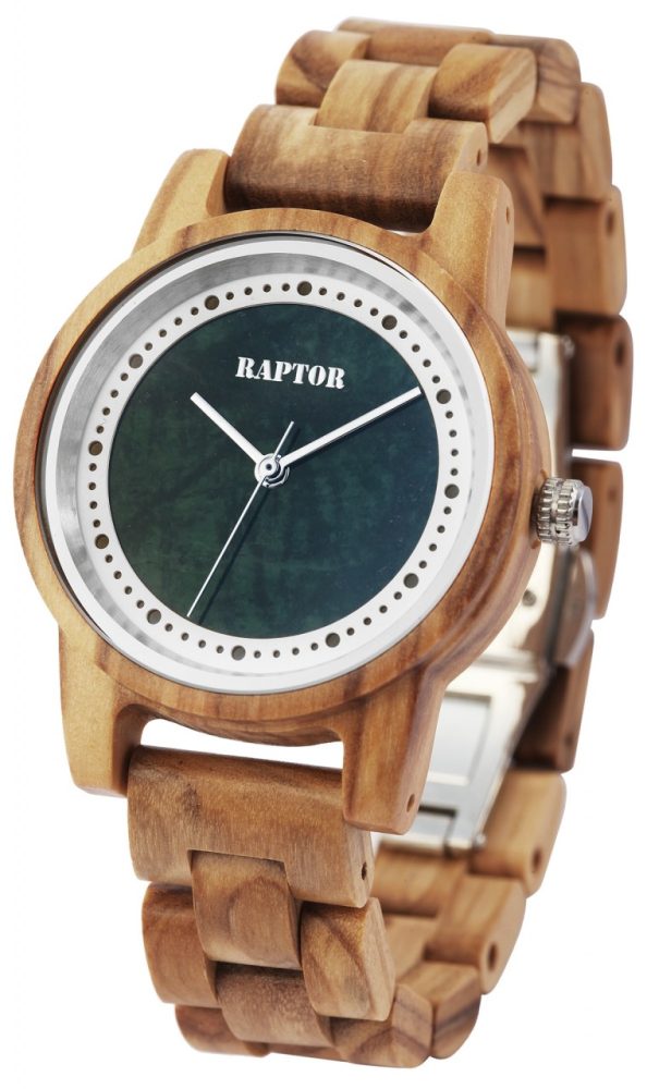 O relógio de pulso feminino analógico de 3 ponteiros da marca Raptor possui o movimento de quartzo de alta qualidade Miyota GL 30. A pulseira de madeira tem 16 mm de largura na alça e pode ser aberta e fechada usando um fecho dobrável em forma de borboleta de aço inoxidável. O comprimento total do relógio é de 19 cm. A caixa de madeira com vidro mineral tem um diâmetro de 36 mm e uma altura de 11 mm. O fundo da caixa também é feito de madeira. Um destaque visual é a borda espelhada de 1 mm de largura no vidro mineral. Isto, em combinação com os ponteiros do relógio, confere-lhe uma aparência especial e elegante. Graças ao material leve, adapta-se perfeitamente ao pulso e é confortável de usar.