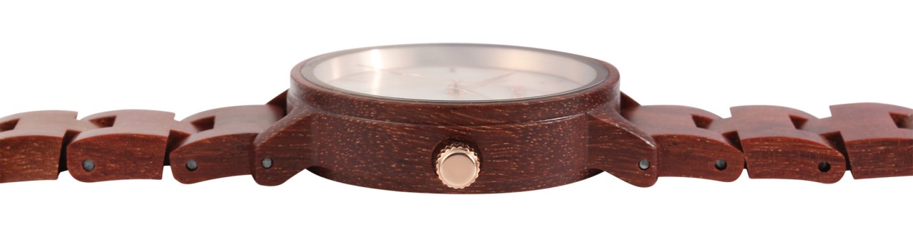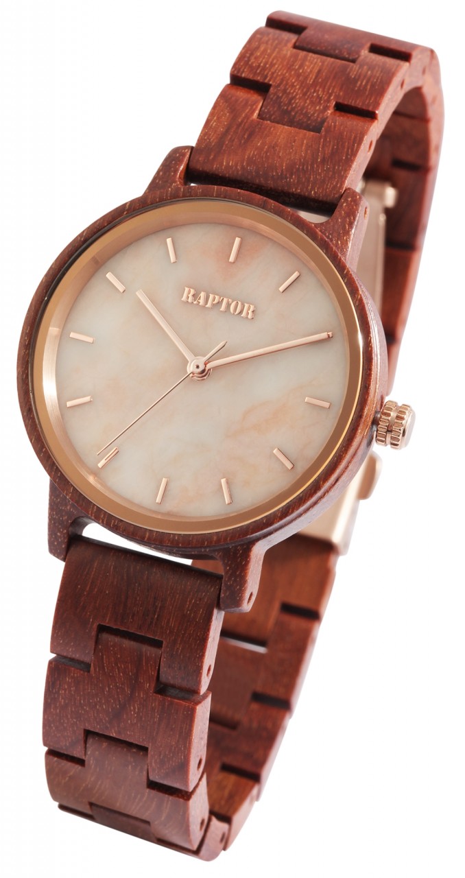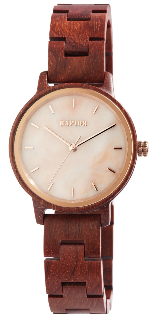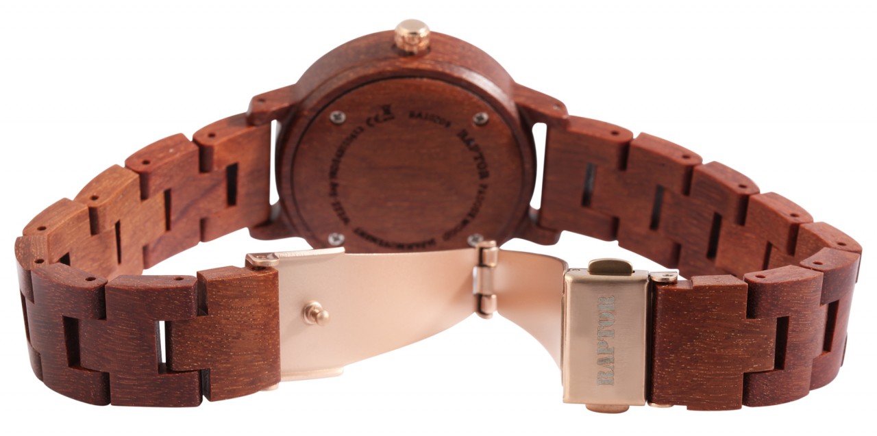 O relógio de pulso feminino analógico de 3 ponteiros da marca Raptor possui o movimento de quartzo Miyota GL30 de alta qualidade. A pulseira de madeira tem 16 mm de largura na alça e pode ser aberta e fechada com um fecho dobrável em aço inoxidável. O comprimento total do relógio é de 22 cm. A caixa de madeira com vidro mineral tem um diâmetro de 36 mm e uma altura de 11 mm. O fundo da caixa também é feito de madeira. Um destaque visual é a borda espelhada de 1 mm de largura no vidro mineral. Os ponteiros são feitos na mesma cor da borda do espelho e juntos conferem ao relógio um visual especial e elegante. Graças ao material leve, adapta-se perfeitamente ao pulso para obter um conforto de utilização fantástico.