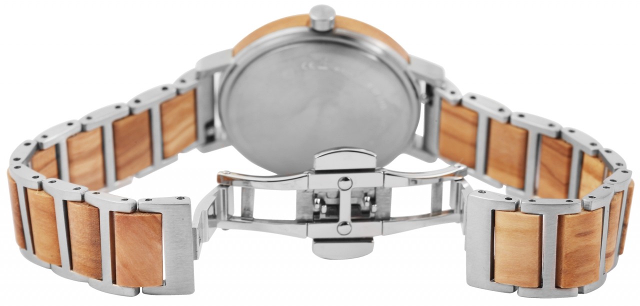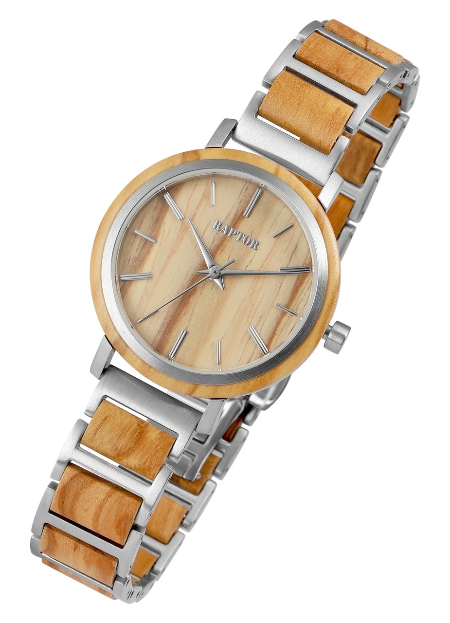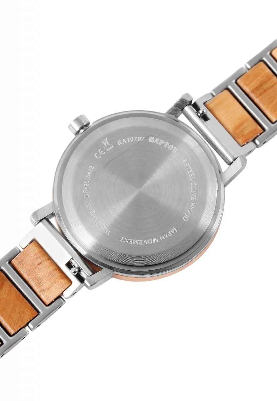 O relógio de pulso feminino analógico de 3 ponteiros da marca Raptor possui o movimento de quartzo Miyota GL30 de alta qualidade. A bracelete de madeira e aço inoxidável tem 14 mm de largura na alça e pode ser aberta e fechada usando um fecho dobrável tipo borboleta em aço inoxidável. O relógio tem comprimento total de 20 cm. A caixa de madeira e aço inoxidável está equipada com vidro mineral. Mede 32 mm de diâmetro e 7 mm de altura, sendo portanto muito plano. O fundo da caixa é feito de aço inoxidável. Destaque para a combinação do aço inoxidável com a madeira, que resulta em um caimento robusto e confortável.