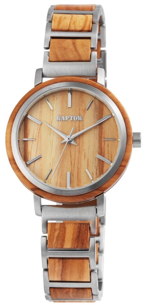 O relógio de pulso feminino analógico de 3 ponteiros da marca Raptor possui o movimento de quartzo Miyota GL30 de alta qualidade. A bracelete de madeira e aço inoxidável tem 14 mm de largura na alça e pode ser aberta e fechada usando um fecho dobrável tipo borboleta em aço inoxidável. O relógio tem comprimento total de 20 cm. A caixa de madeira e aço inoxidável está equipada com vidro mineral. Mede 32 mm de diâmetro e 7 mm de altura, sendo portanto muito plano. O fundo da caixa é feito de aço inoxidável. Destaque para a combinação do aço inoxidável com a madeira, que resulta em um caimento robusto e confortável.