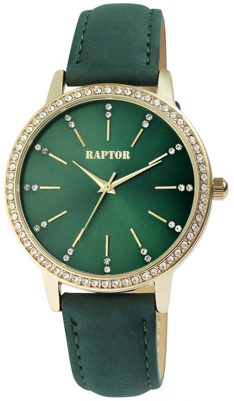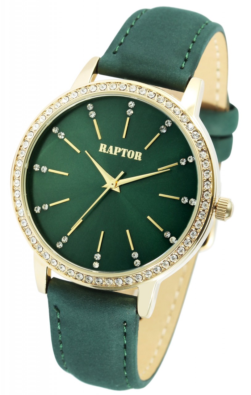 O relógio de pulso analógico de 3 ponteiros para senhora da marca Raptor possui um movimento de quartzo de alta qualidade. A bracelete em pele genuína tem 18 mm de largura na extremidade e pode ser aberta e fechada com uma fivela em aço inoxidável. O comprimento total do relógio é de 24 cm. A caixa metálica com vidro mineral tem um diâmetro de 40 mm e uma altura de 8 mm. O fundo da caixa é feito de aço inoxidável e o relógio tem uma resistência à água de 3 ATM. O mostrador é monocromático e combina bem com o aspeto geral do relógio. Os ponteiros e os números são da mesma cor que a caixa e completam o design harmonioso deste relógio de pulso moderno. Um destaque visual é a luneta do relógio, que é decorada com 60 pedras brilhantes semelhantes.