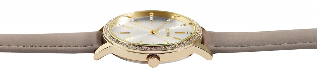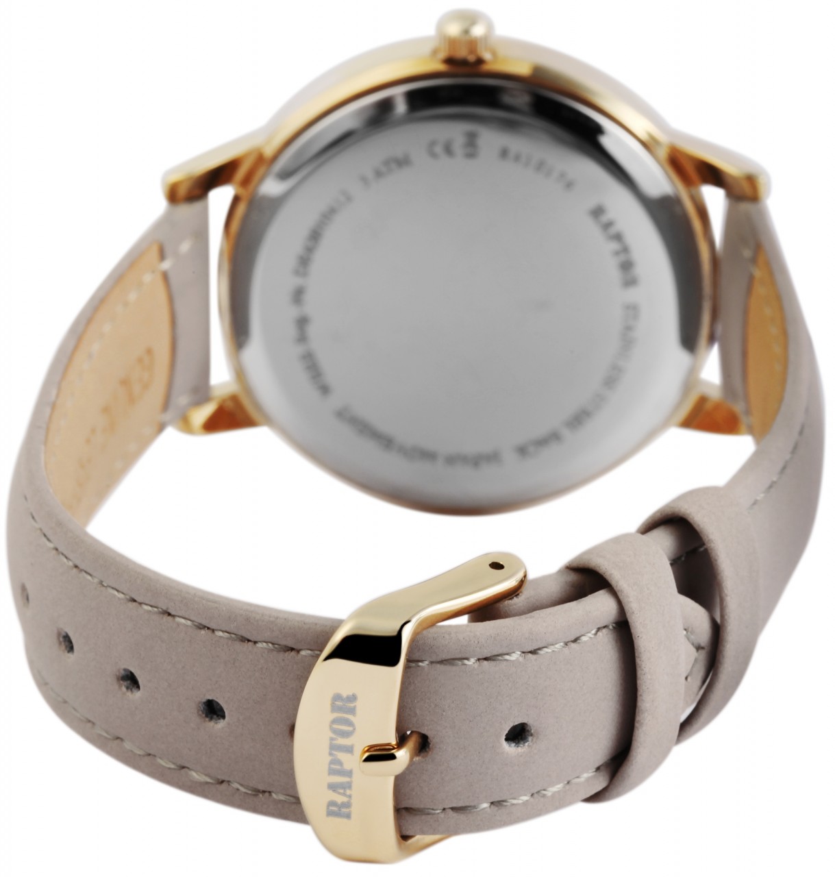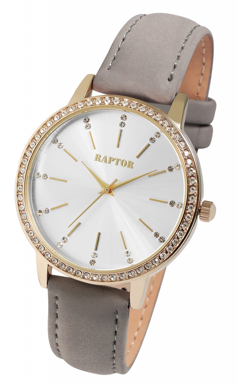 O relógio de pulso analógico de 3 ponteiros para senhora da marca Raptor possui um movimento de quartzo de alta qualidade. A bracelete em pele genuína tem 18 mm de largura na extremidade e pode ser aberta e fechada com uma fivela em aço inoxidável. O comprimento total do relógio é de 24 cm. A caixa metálica com vidro mineral tem um diâmetro de 40 mm e uma altura de 8 mm. O fundo da caixa é feito de aço inoxidável e o relógio tem uma resistência à água de 3 ATM. O mostrador é monocromático e combina bem com o aspeto geral do relógio. Os ponteiros e os números são da mesma cor que a caixa e completam o design harmonioso deste relógio de pulso moderno. Um destaque visual é a luneta do relógio, que é decorada com 60 pedras brilhantes semelhantes.
