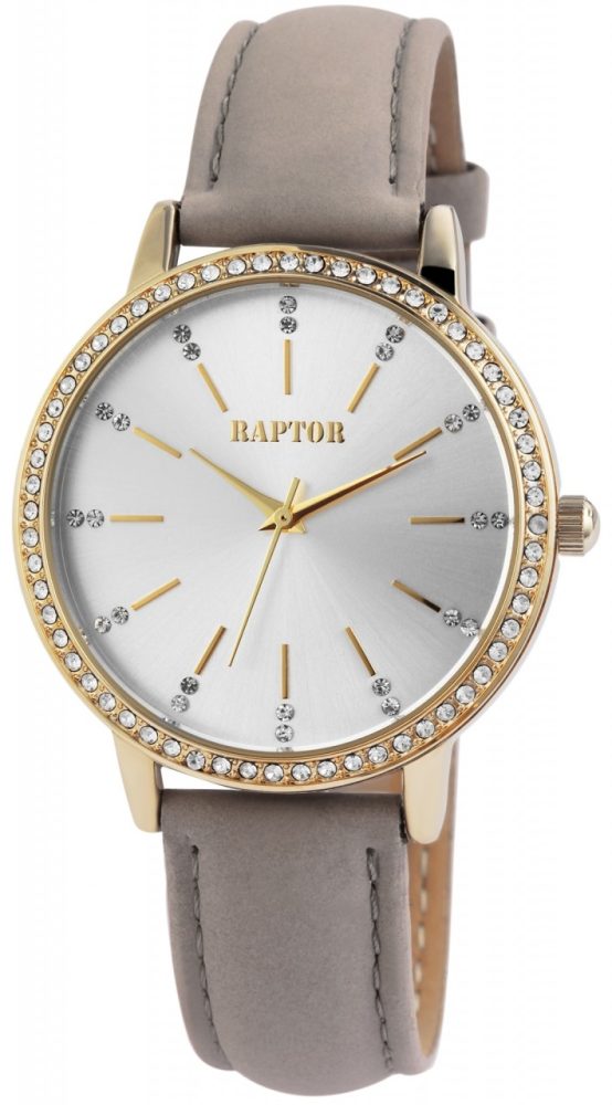 O relógio de pulso analógico de 3 ponteiros para senhora da marca Raptor possui um movimento de quartzo de alta qualidade. A bracelete em pele genuína tem 18 mm de largura na extremidade e pode ser aberta e fechada com uma fivela em aço inoxidável. O comprimento total do relógio é de 24 cm. A caixa metálica com vidro mineral tem um diâmetro de 40 mm e uma altura de 8 mm. O fundo da caixa é feito de aço inoxidável e o relógio tem uma resistência à água de 3 ATM. O mostrador é monocromático e combina bem com o aspeto geral do relógio. Os ponteiros e os números são da mesma cor que a caixa e completam o design harmonioso deste relógio de pulso moderno. Um destaque visual é a luneta do relógio, que é decorada com 60 pedras brilhantes semelhantes.