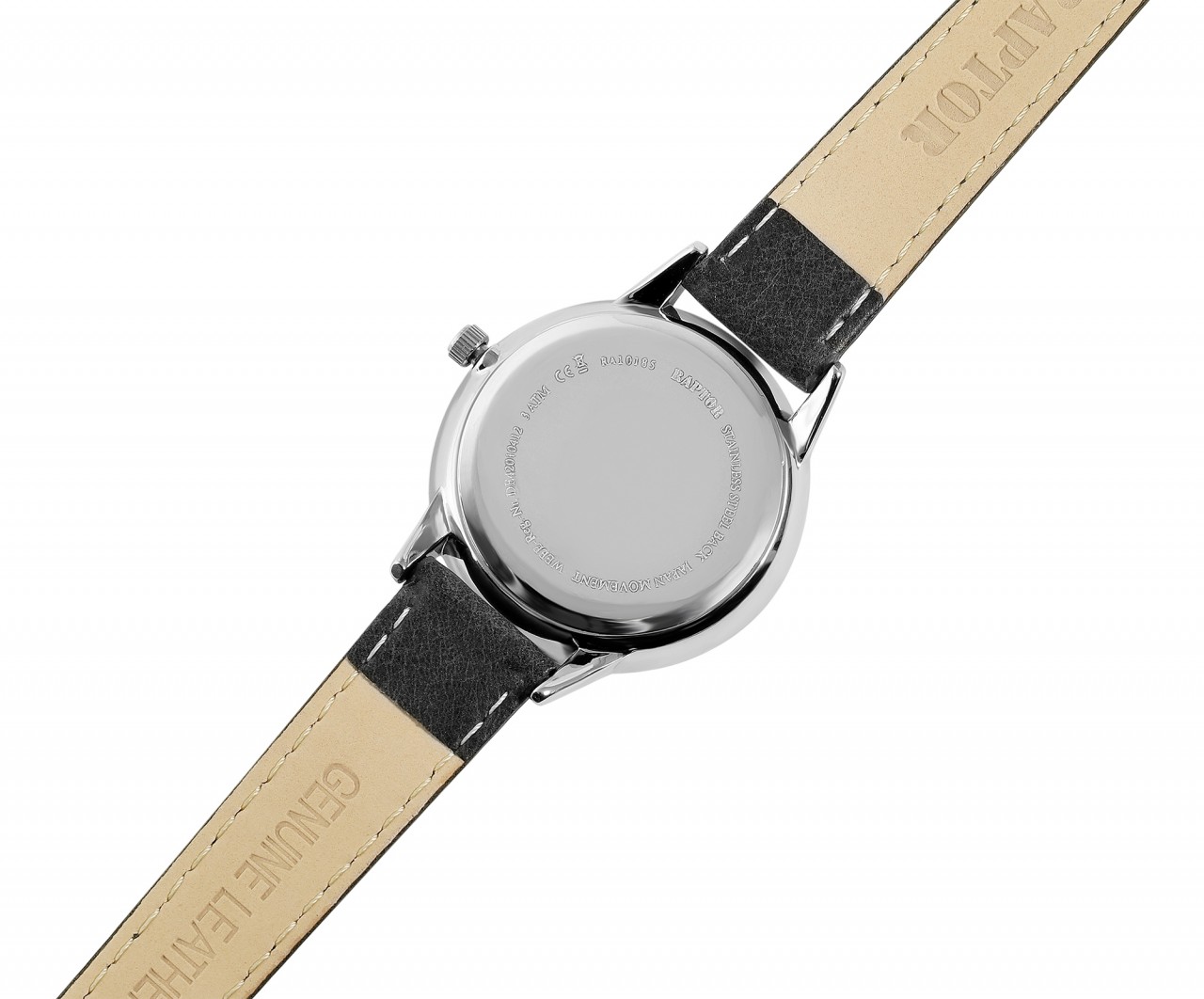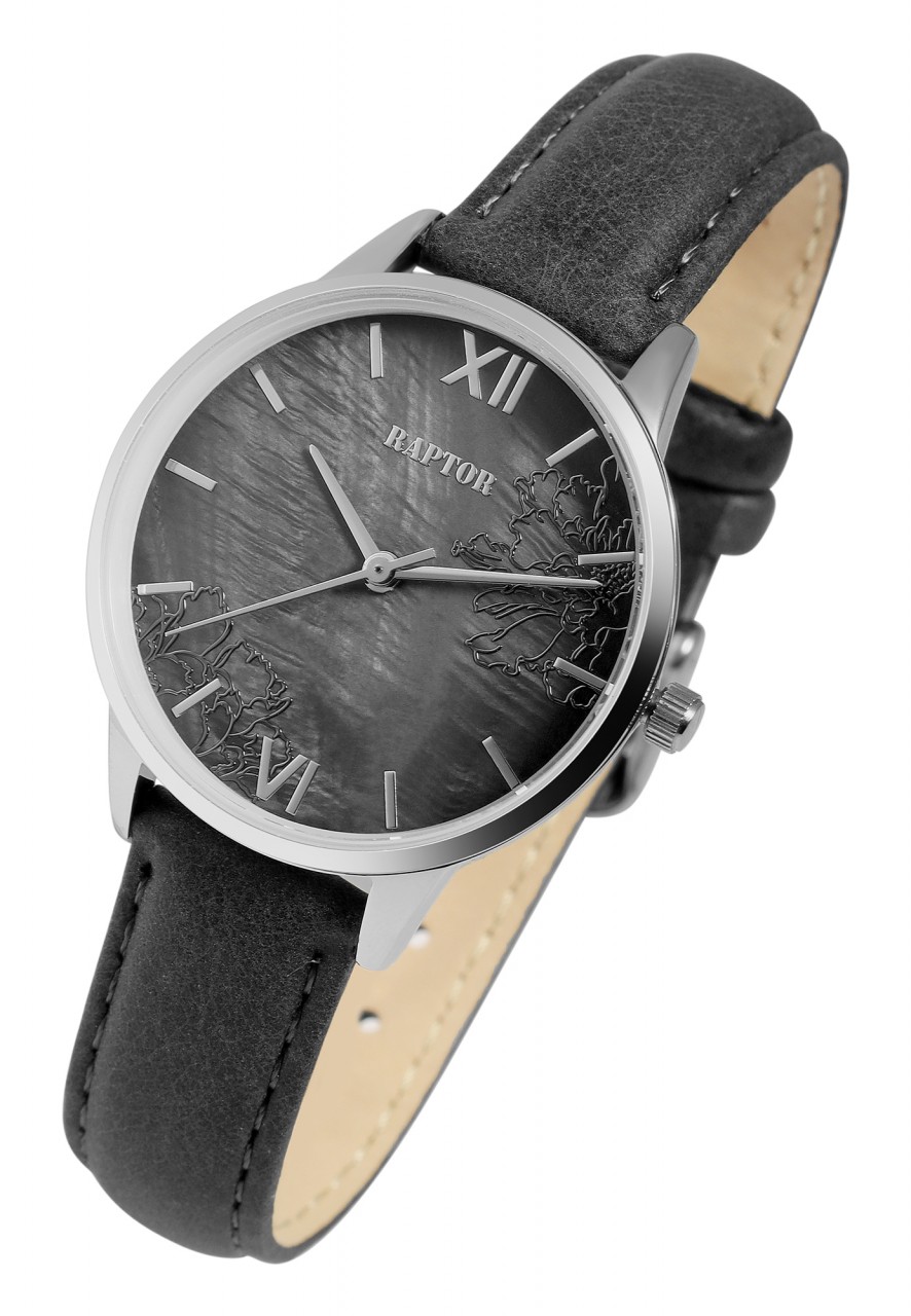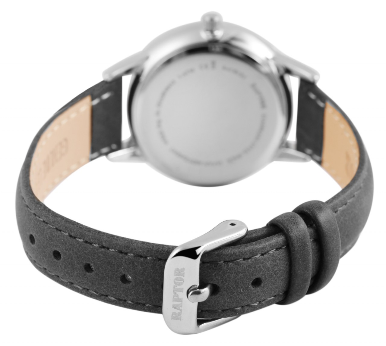O relógio de pulso analógico para mulher da marca Raptor “Narce” possui um movimento de quartzo de alta qualidade. A bracelete em pele genuína tem 14 mm de largura e tem uma fivela em aço inoxidável. O comprimento total do relógio é de 22 cm. A caixa metálica com vidro mineral tem um diâmetro de 32 mm e uma altura de 7 mm. O fundo da caixa é feito de aço inoxidável.