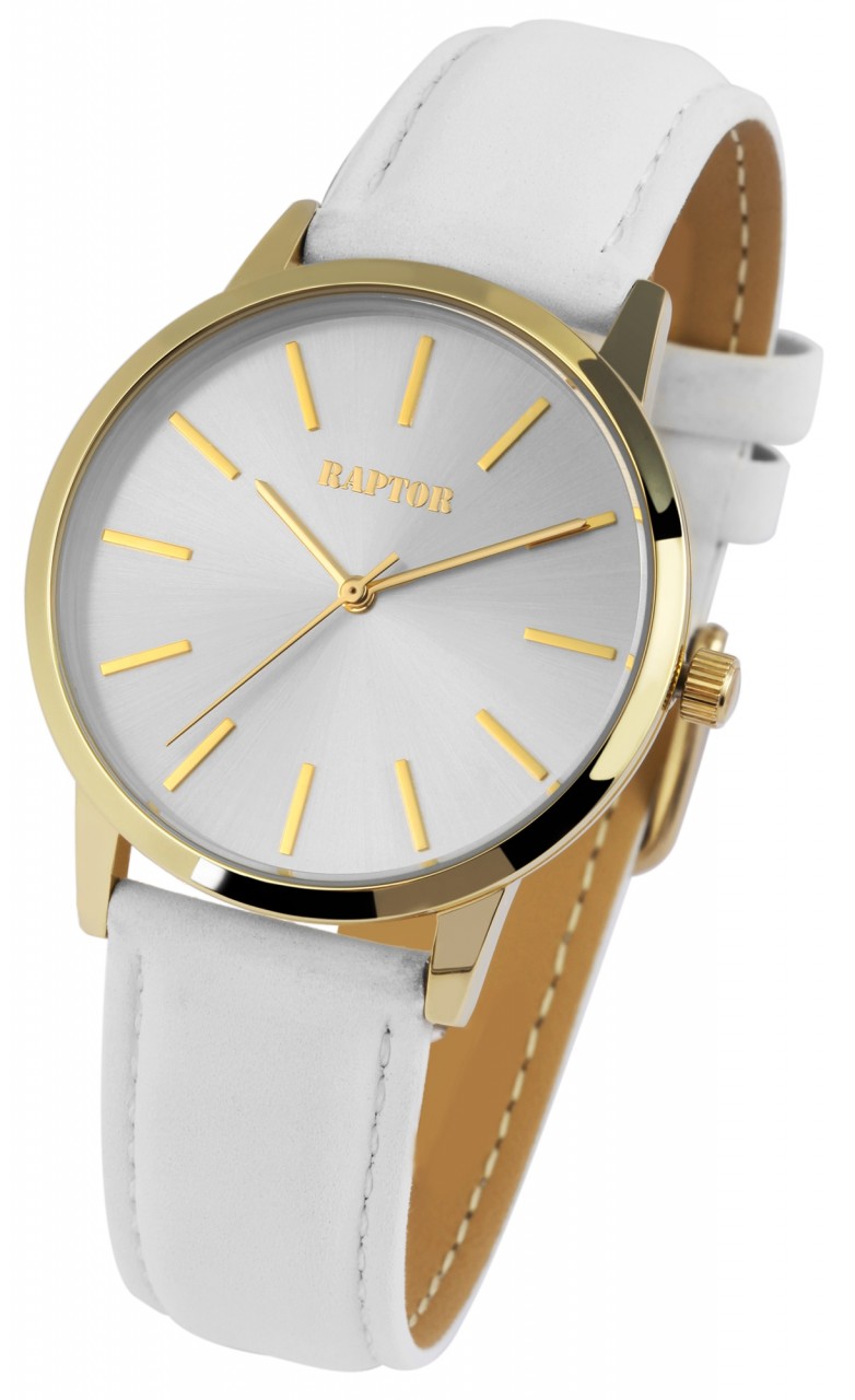 O relógio de pulso analógico de mulher da marca Raptor possui um movimento de quartzo de alta qualidade. A bracelete em pele genuína tem 18 mm de largura na extremidade e pode ser aberta e fechada com uma fivela de pino. O comprimento total do relógio é de 23.5 cm. A caixa metálica com vidro mineral tem um diâmetro de 36 mm e uma altura de 8 mm.