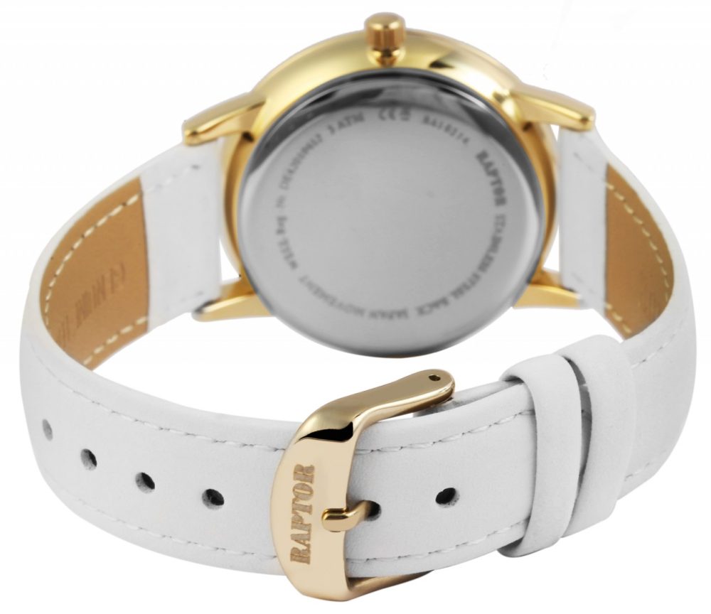 O relógio de pulso analógico de mulher da marca Raptor possui um movimento de quartzo de alta qualidade. A bracelete em pele genuína tem 18 mm de largura na extremidade e pode ser aberta e fechada com uma fivela de pino. O comprimento total do relógio é de 23.5 cm. A caixa metálica com vidro mineral tem um diâmetro de 36 mm e uma altura de 8 mm.