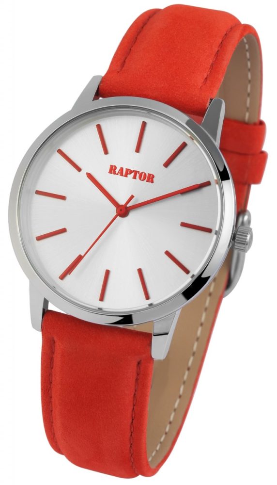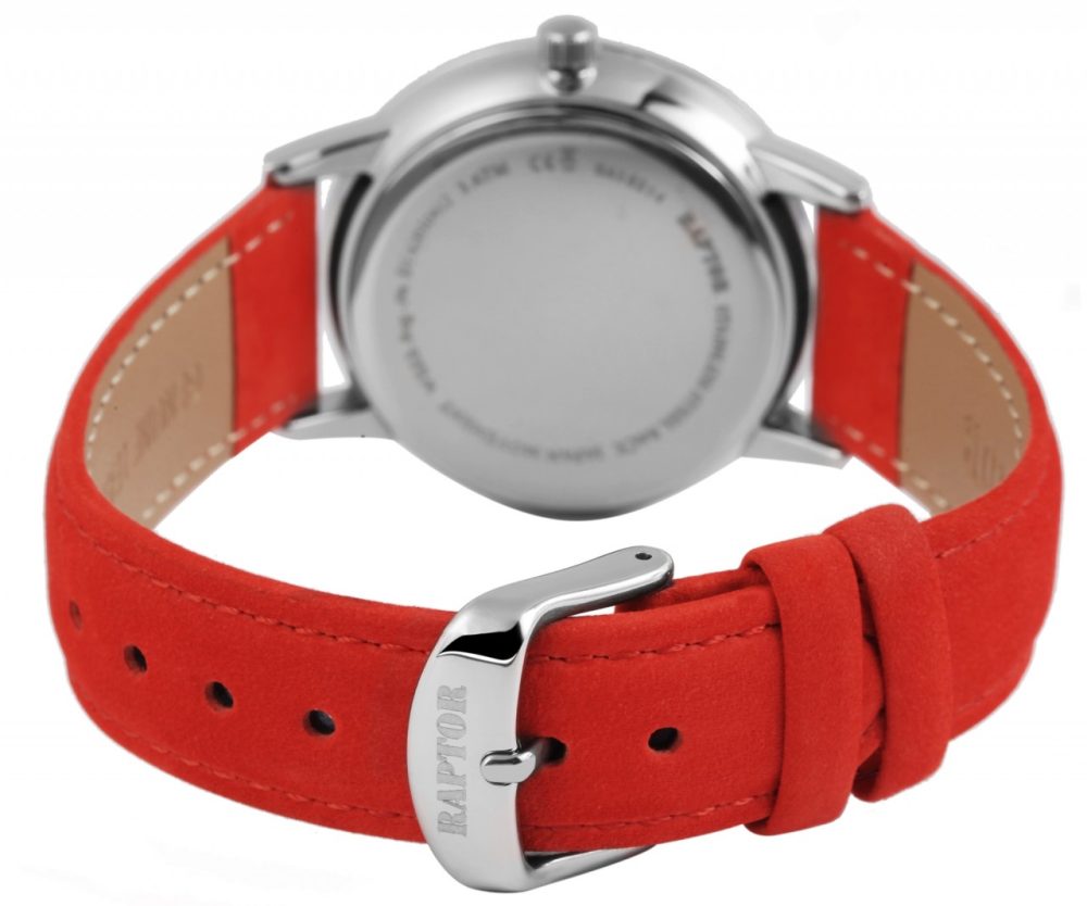 O relógio de pulso analógico de mulher da marca Raptor possui um movimento de quartzo de alta qualidade. A bracelete em pele genuína tem 18 mm de largura na extremidade e pode ser aberta e fechada com uma fivela de pino. O comprimento total do relógio é de 23.5 cm. A caixa metálica com vidro mineral tem um diâmetro de 36 mm e uma altura de 8 mm.
