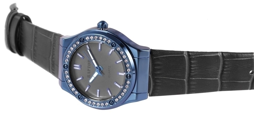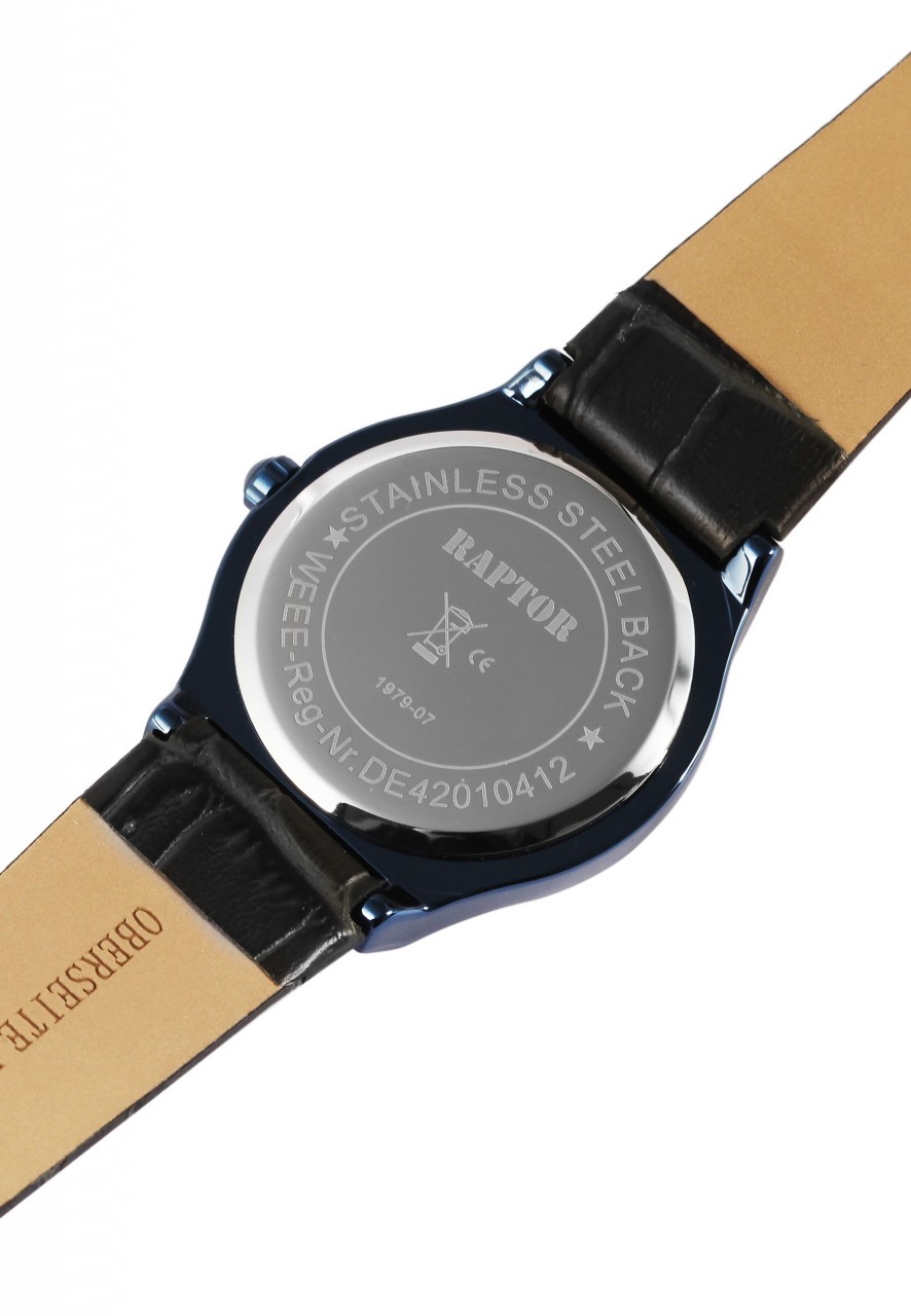O relógio analógico feminino da marca Raptor possui movimento Miyota 2035. A bracelete com pele genuína na parte superior e pele sintética na parte inferior tem 16 mm de largura e abre com uma fivela de aço inoxidável. O comprimento total é de 22 cm. A caixa de metal com vidro mineral tem um diâmetro de 38 mm e uma altura de 10 mm. A tampa da caixa é feita de aço inoxidável.