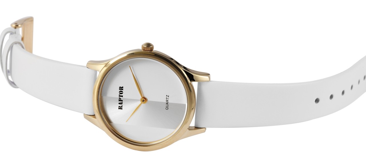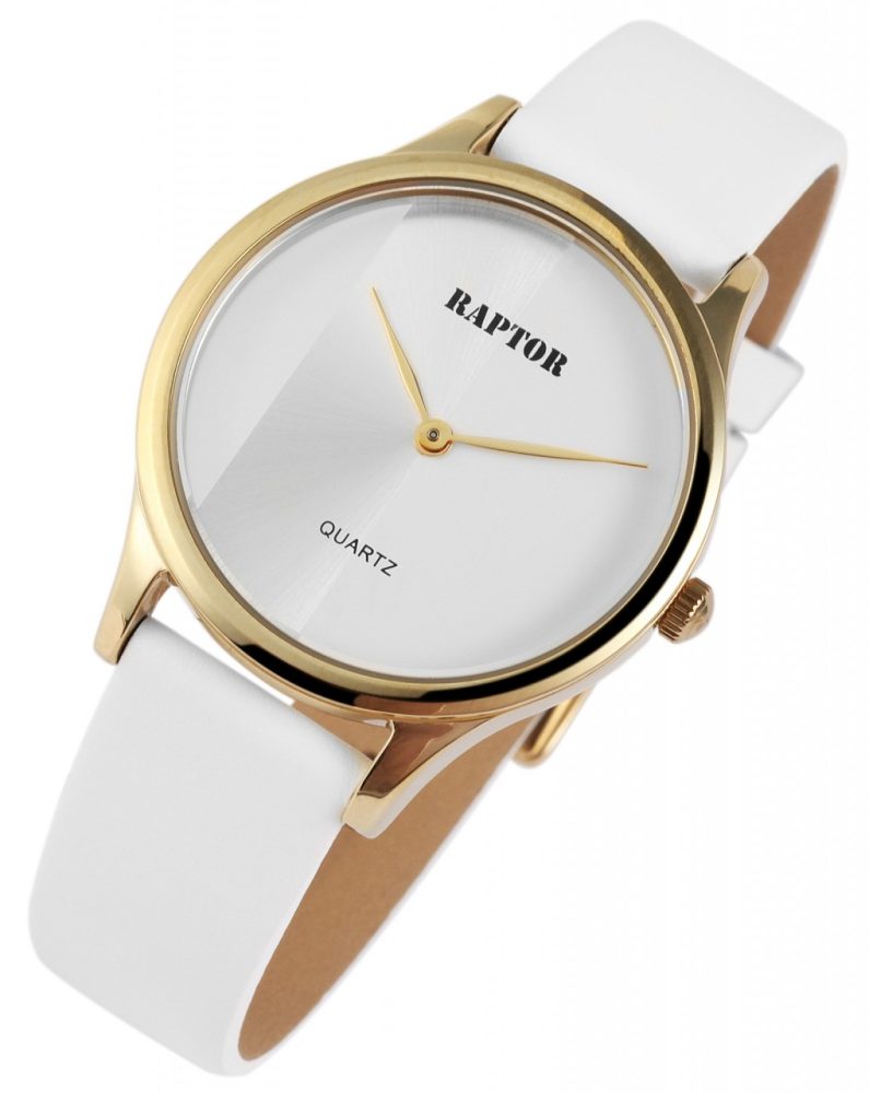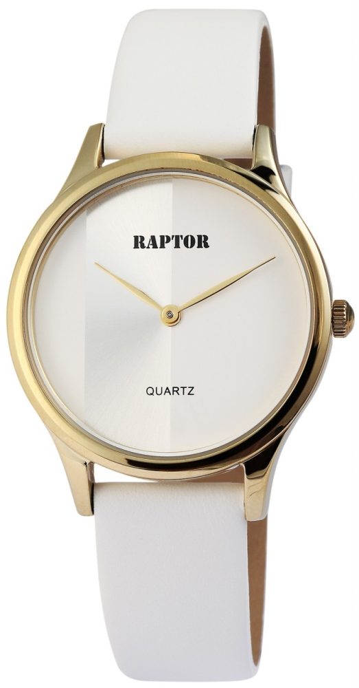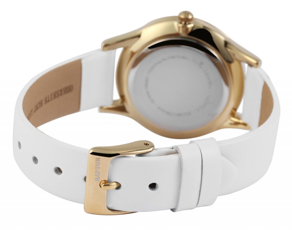 O relógio analógico feminino da marca Raptor possui movimento Y120E1. A bracelete com pele genuína na parte superior e pele sintética na parte inferior tem 16 mm de largura e abre com uma fivela de aço inoxidável. O comprimento total é de 19 cm. A caixa de aço inoxidável com vidro mineral tem um diâmetro de 34 mm e uma altura de 8 mm. A tampa da caixa é feita de aço inoxidável.