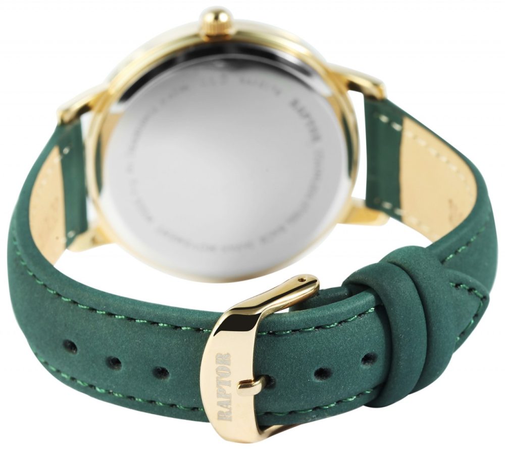 O relógio de pulso analógico de 3 ponteiros para senhora da marca Raptor possui um movimento de quartzo de alta qualidade. A bracelete em pele genuína tem 18 mm de largura na extremidade e pode ser aberta e fechada com uma fivela em aço inoxidável. O comprimento total do relógio é de 24 cm. A caixa metálica com vidro mineral tem um diâmetro de 40 mm e uma altura de 8 mm. O fundo da caixa é feito de aço inoxidável e o relógio tem uma resistência à água de 3 ATM. O mostrador é monocromático e combina bem com o aspeto geral do relógio. Os ponteiros e os números são da mesma cor que a caixa e completam o…