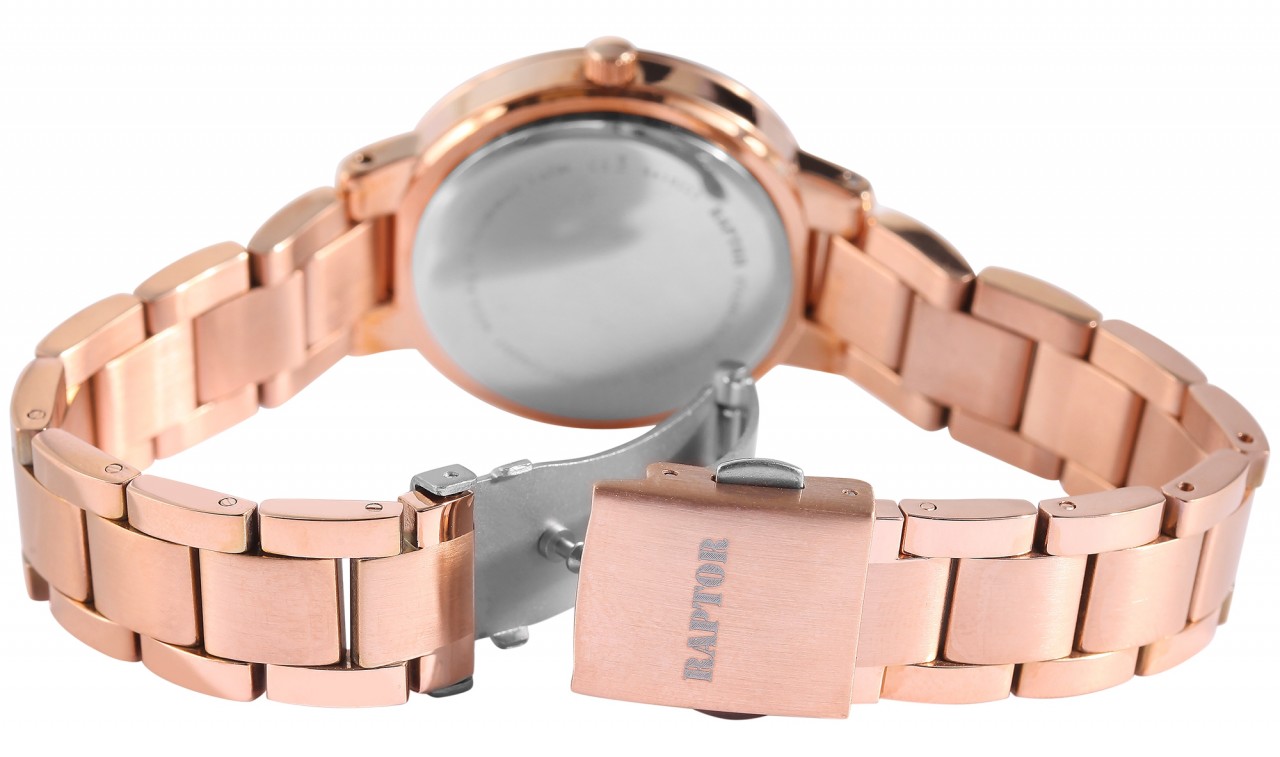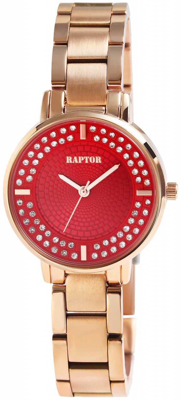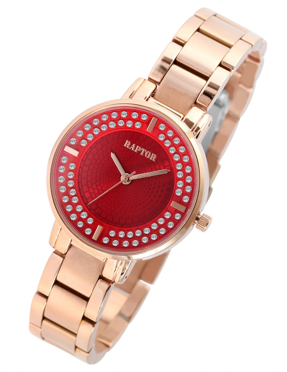 O relógio de pulso analógico de 3 ponteiros para senhora da marca Raptor possui um movimento de quartzo de alta qualidade. A bracelete em aço inoxidável tem uma largura de 16 mm e pode ser aberta e fechada com um fecho desdobrável. O comprimento total do relógio é de 18 cm. A caixa metálica com vidro mineral tem um diâmetro de 32 mm e uma altura de 6 mm. O que mais chama a atenção neste modelo de senhora é o mostrador cravejado de pedras semelhantes. Estas servem de índices de pontos e estão dispostas em duas filas. Os ponteiros e os índices condizem com a cor da caixa do relógio, completando harmoniosamente o aspeto geral. O fundo da caixa é feito de aço inoxidável e o relógio tem uma resistência à água de 3 bar. Receberá um cartão de garantia e uma caixa original Raptor como acessórios para o seu produto.