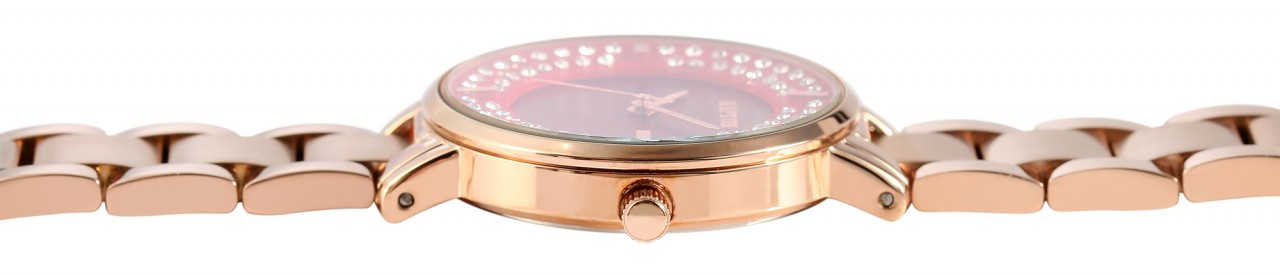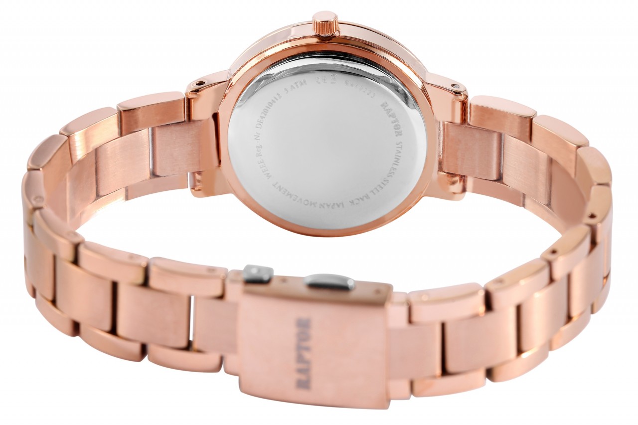 O relógio de pulso analógico de 3 ponteiros para senhora da marca Raptor possui um movimento de quartzo de alta qualidade. A bracelete em aço inoxidável tem uma largura de 16 mm e pode ser aberta e fechada com um fecho desdobrável. O comprimento total do relógio é de 18 cm. A caixa metálica com vidro mineral tem um diâmetro de 32 mm e uma altura de 6 mm. O que mais chama a atenção neste modelo de senhora é o mostrador cravejado de pedras semelhantes. Estas servem de índices de pontos e estão dispostas em duas filas. Os ponteiros e os índices condizem com a cor da caixa do relógio, completando harmoniosamente o aspeto geral. O fundo da caixa…