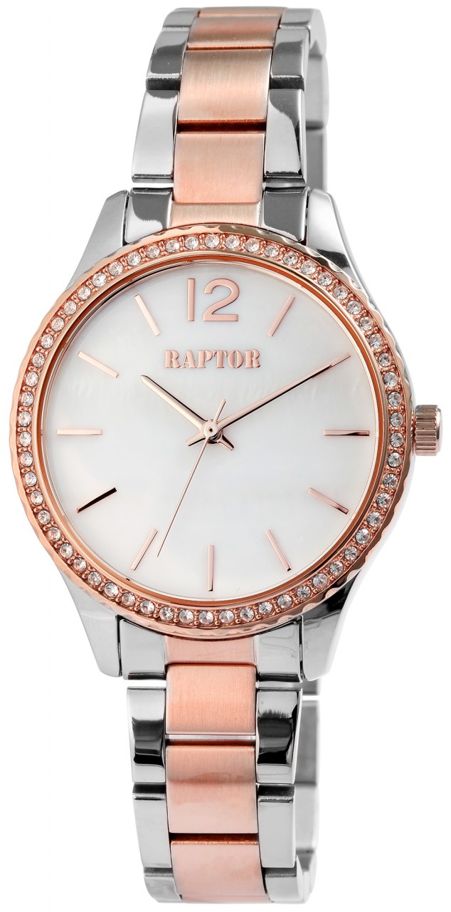 O relógio de pulso feminino analógico de 3 ponteiros da Raptor possui um movimento de quartzo de alta qualidade. A pulseira de aço inoxidável tem 16 mm de largura na alça e pode ser aberto e fechado com um fecho dobrável em aço inoxidável. O comprimento total do relógio é de 21 cm. A caixa de metal com vidro mineral tem um diâmetro de 36 mm e uma altura de 8 mm. O fundo da caixa é feito de aço inoxidável e o relógio tem resistência à água de 3 bar.