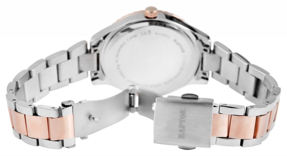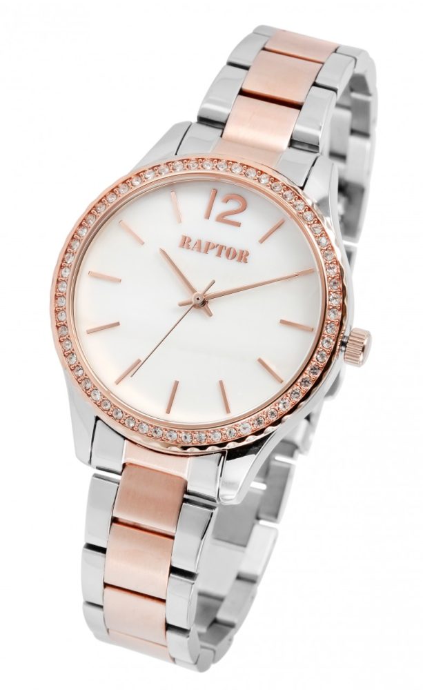 O relógio de pulso feminino analógico de 3 ponteiros da Raptor possui um movimento de quartzo de alta qualidade. A pulseira de aço inoxidável tem 16 mm de largura na alça e pode ser aberto e fechado com um fecho dobrável em aço inoxidável. O comprimento total do relógio é de 21 cm. A caixa de metal com vidro mineral tem um diâmetro de 36 mm e uma altura de 8 mm. O fundo da caixa é feito de aço inoxidável e o relógio tem resistência à água de 3 bar.