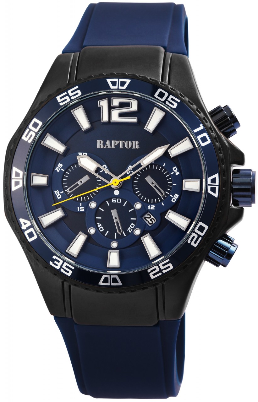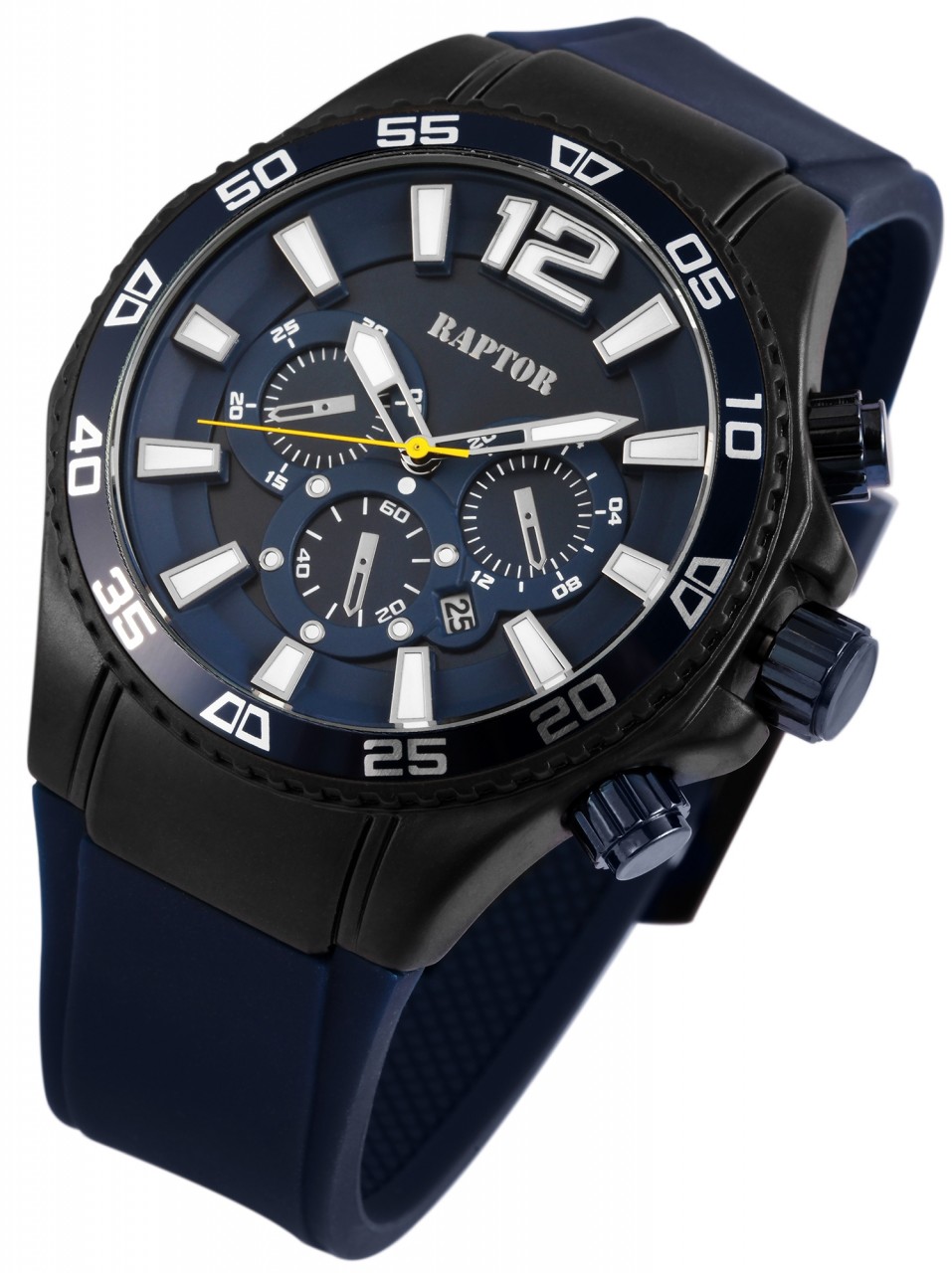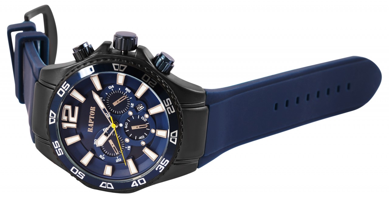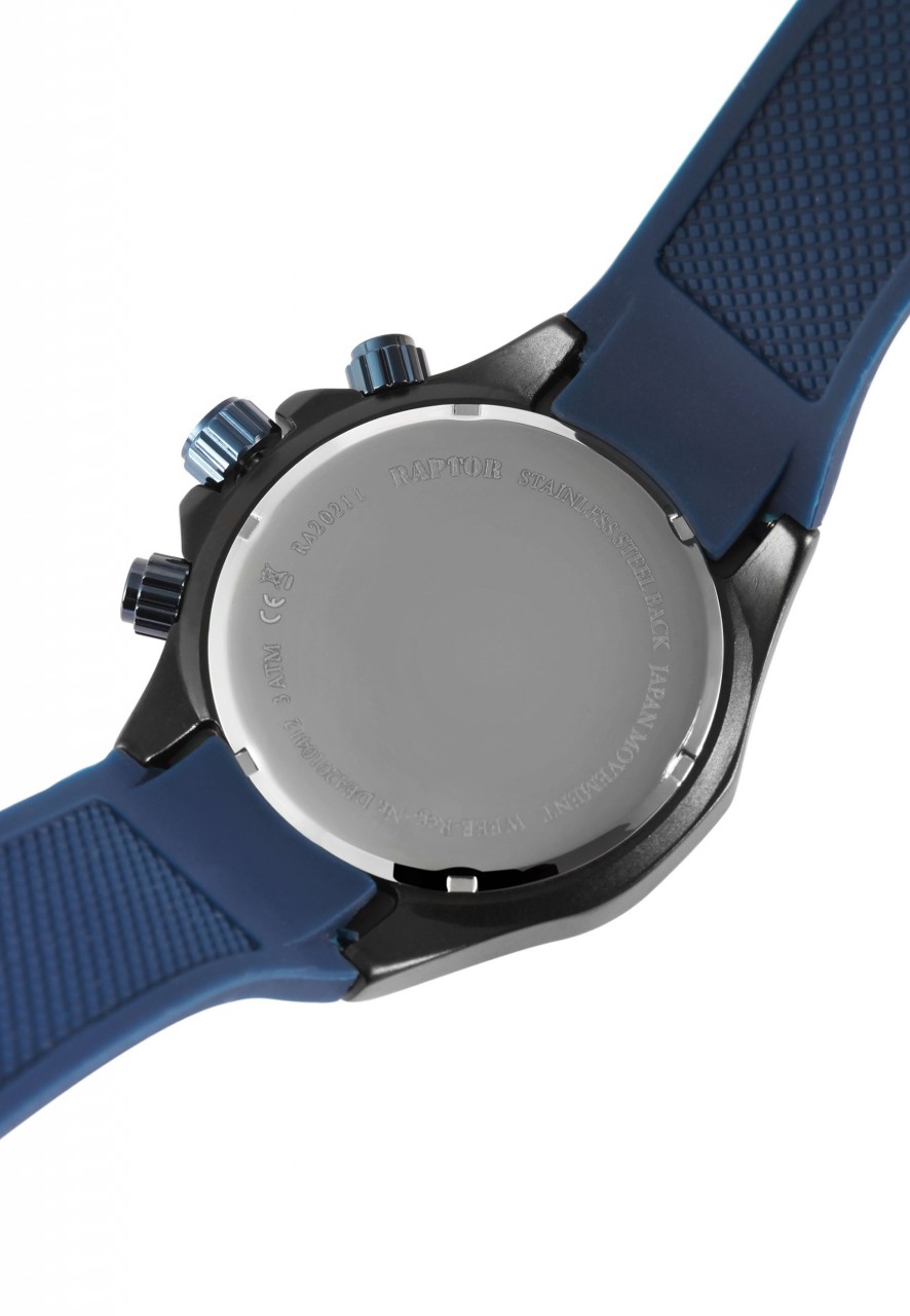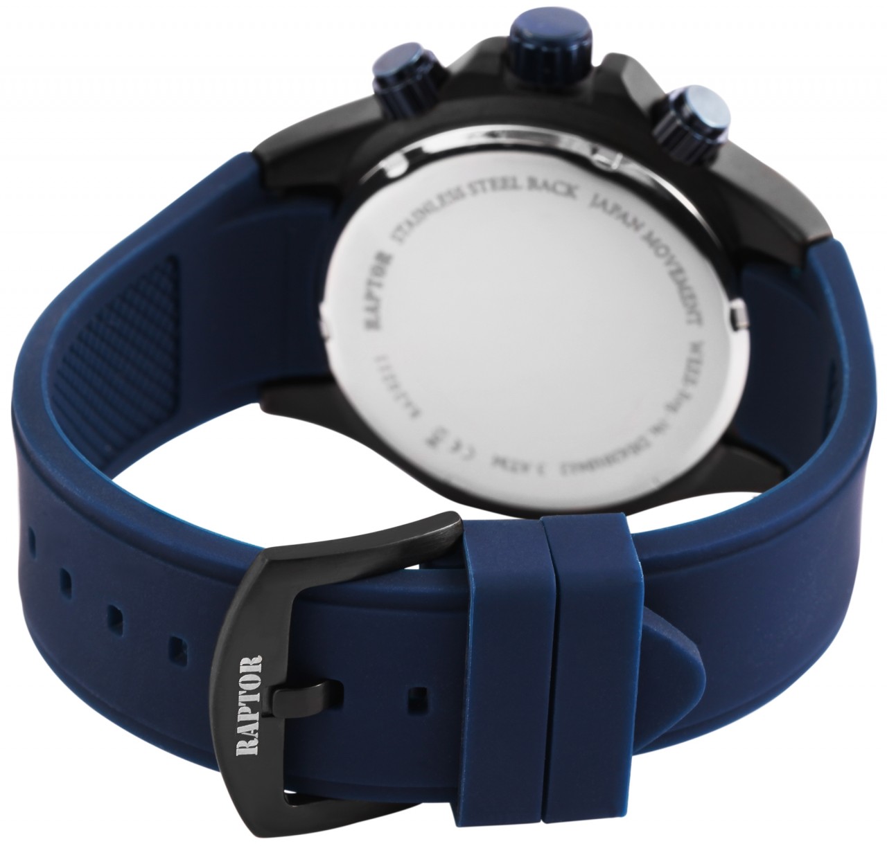 O relógio de pulso para homem da marca Raptor possui um movimento analógico de quartzo de alta qualidade. Possui uma pulseira com 26 mm de largura e um mostrador com 48 mm de diâmetro e uma altura de 13mm. O fundo da caixa é feito de aço inoxidável e o relógio tem resistência à água de 3bar.