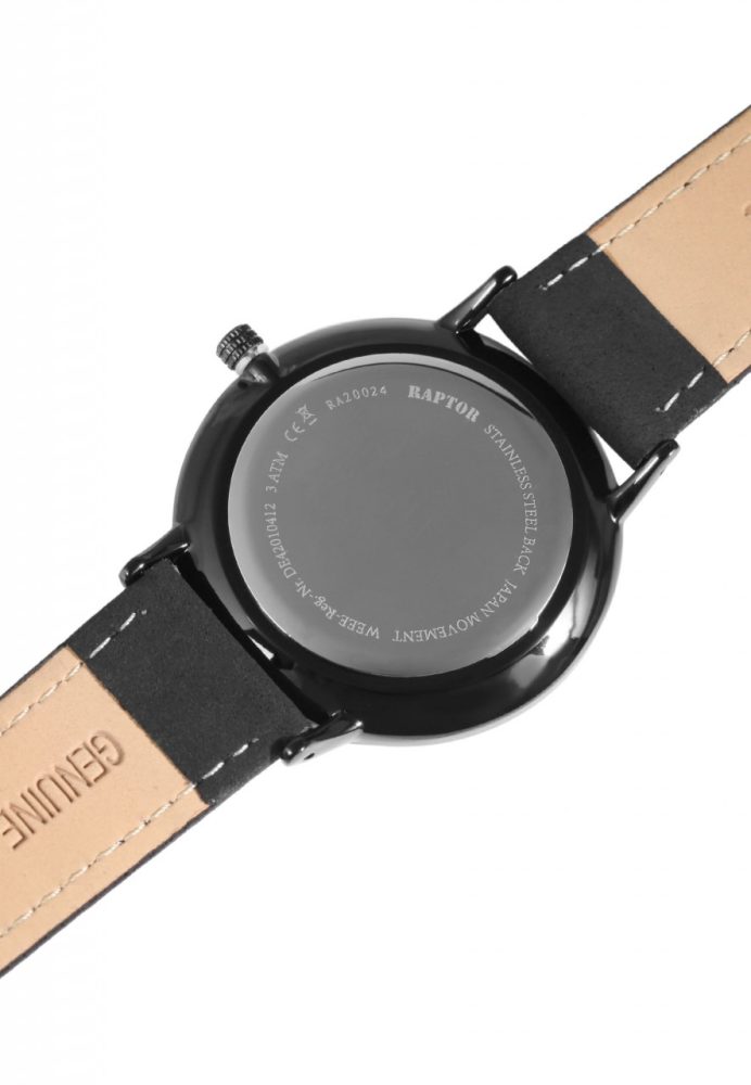 O relógio unissexo analógico da marca Raptor tem um GL20 e a designação do modelo é RA064. Bracelete em Pele Genuína tem 20 mm de largura e abre-se com um fecho de gancho. O comprimento total é de 18 cm. A caixa metálica com vidro mineral mede 40 mm e tem 7 mm de altura. A tampa da caixa é feita de aço inoxidável. O acabamento em cristal no mostrador é também um destaque visual.