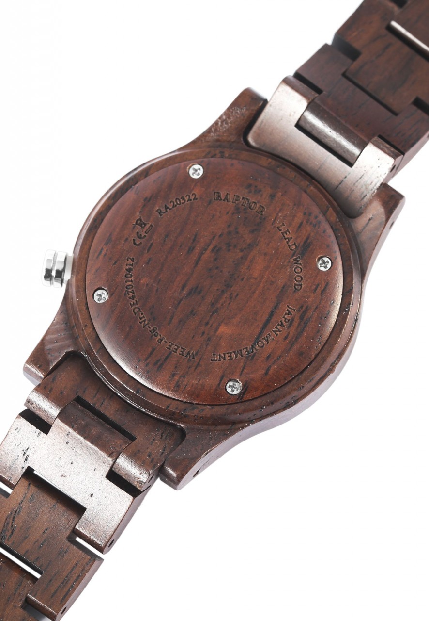 O relógio de pulso unissexo analógico de 3 ponteiros da marca Raptor possui um movimento de quartzo Miyota 2115 de alta qualidade. A bracelete de madeira tem 20 mm de largura na extremidade e pode ser aberta e fechada com um fecho de borboleta em aço inoxidável. O comprimento total do relógio é de 22,5 cm. A caixa de madeira com vidro mineral tem um diâmetro de 40 mm e uma altura de 12 mm. O fundo da caixa também é de madeira. Os ponteiros são prateados e existe uma janela de data às "4 horas". Com o relógio de madeira Raptor, está a usar no seu pulso um verdadeiro chamariz que pode combinar com qualquer ocasião. Como o material…