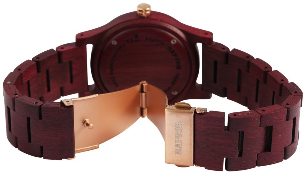 O relógio de pulso analógico unissexo de 3 ponteiros da marca Raptor possui o movimento de quartzo Miyota GM12 de alta qualidade. A pulseira de madeira tem 20 mm de largura na alça e pode ser aberta e fechada com um fecho dobrável em aço inoxidável. O comprimento total do relógio é de 23,5 cm. A caixa de madeira com fundo de madeira da mesma cor e vidro mineral tem diâmetro de 41 mm e altura de caixa de 10 mm. O vidro mineral transparente tem uma borda espelhada e, juntamente com a coroa de cores coordenadas, confere ao relógio uma aparência elegante. A divisão do mostrador é simples e tem aspeto de metal brilhante. O ponteiro azul claro dos segundos é marcante e com certeza não passará despercebido. O relógio de madeira Raptor também possui uma exibição de data às três horas. Como acessórios do seu produto, você receberá um cartão de garantia e uma caixa original da marca Raptor.