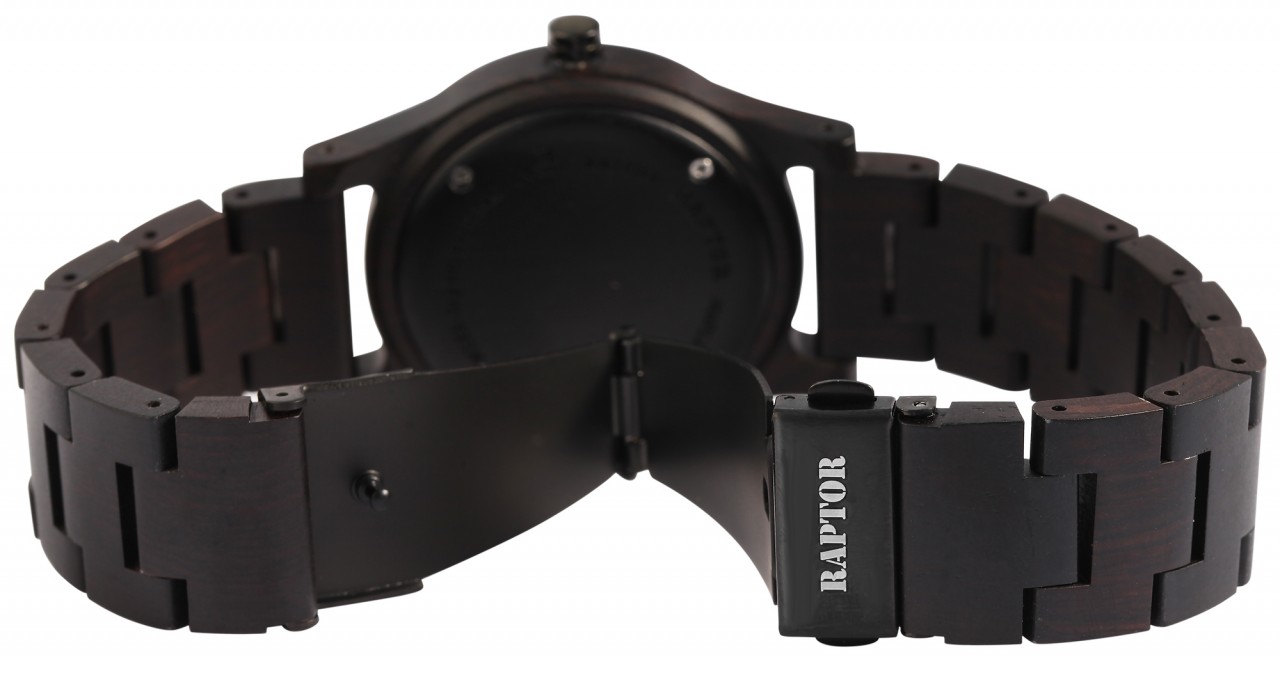 O relógio de pulso analógico unissexo de 3 ponteiros da marca Raptor possui o movimento de quartzo Miyota GM12 de alta qualidade. A bracelete de madeira tem 20 mm de largura na alça e pode ser aberta e fechada com um fecho dobrável em aço inoxidável. O comprimento total do relógio é de 23,5 cm. A caixa de madeira com fundo de madeira da mesma cor e vidro mineral tem diâmetro de 41 mm e altura de caixa de 10 mm. O vidro mineral transparente tem uma borda espelhada e, juntamente com a coroa de cores coordenadas, confere ao relógio uma aparência elegante. A divisão do mostrador é simples. O ponteiro azul claro dos segundos é marcante e com certeza não passará despercebido. O relógio de madeira Raptor também possui uma exibição de data às três horas. Inclui caixa original da marca Raptor e cartão de garantia.