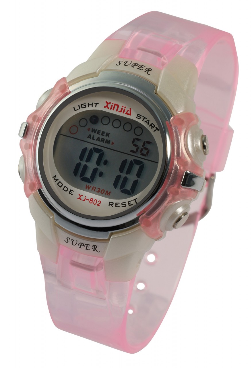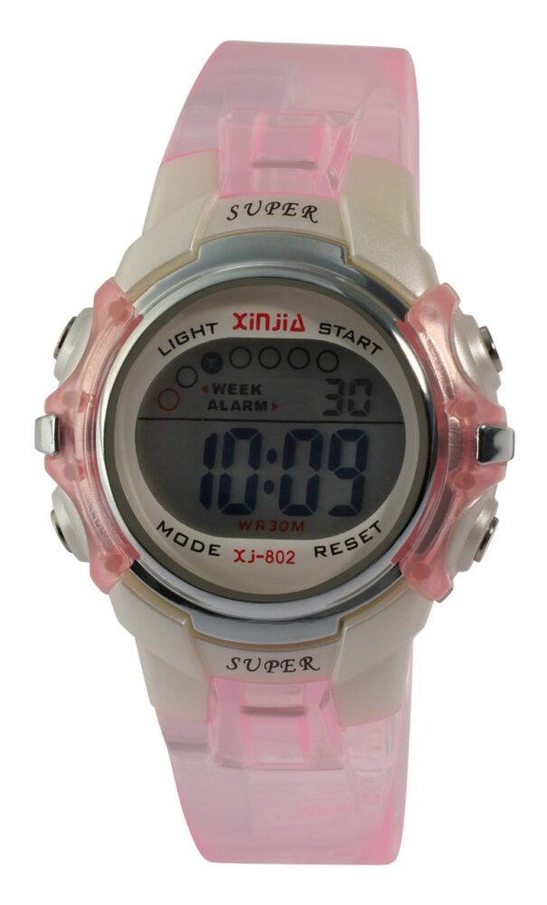O relógio digital Xinjia é uma excelente prenda para os jovens aventureiros. A bracelete em TPU combina flexibilidade e durabilidade. Tem um comprimento total de 22,5 cm e uma largura de 18 mm na extremidade, o que garante um ajuste confortável no pulso. Graças à prática fivela de pino, o relógio é fácil de colocar e de retirar. A caixa do relógio é feita de plástico resistente e tem um diâmetro de 32,5 mm. O fundo da caixa em aço inoxidável garante uma durabilidade adicional e aumenta o conforto de utilização. Este relógio tem muitas funções úteis: indicação de 12/24 horas, da data, do dia da semana (em inglês), alarme, cronómetro, luz e resistência à água de 3 ATM. Quer seja para a escola, lazer ou desporto, o movimento de quartzo de alta qualidade faz deste relógio um companheiro fiável para as crianças e está disponível em muitas cores bonitas.