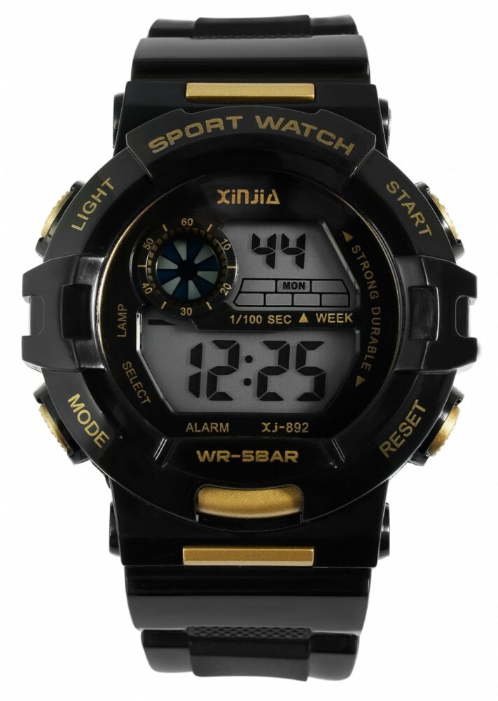 O relógio digital unissexo da marca Xinjia tem um movimento de quartzo de alta qualidade. A bracelete de silicone tem 20 mm de largura na extremidade, tem uma espessura de material de 2,5 mm e pode ser aberta e fechada com uma fivela de pino. O comprimento total do relógio é de 23 cm. A caixa de plástico com vidro de plástico mede 43 mm e tem 16,5 mm de altura. A tampa da caixa é feita de aço inoxidável. O relógio tem uma resistência à água de 5 ATM. Possui ainda as seguintes caraterísticas: indicação da data, do mês, do dia da semana, função de paragem, função de alarme e luz. Receberá um manual de instruções como acessório do seu produto.
