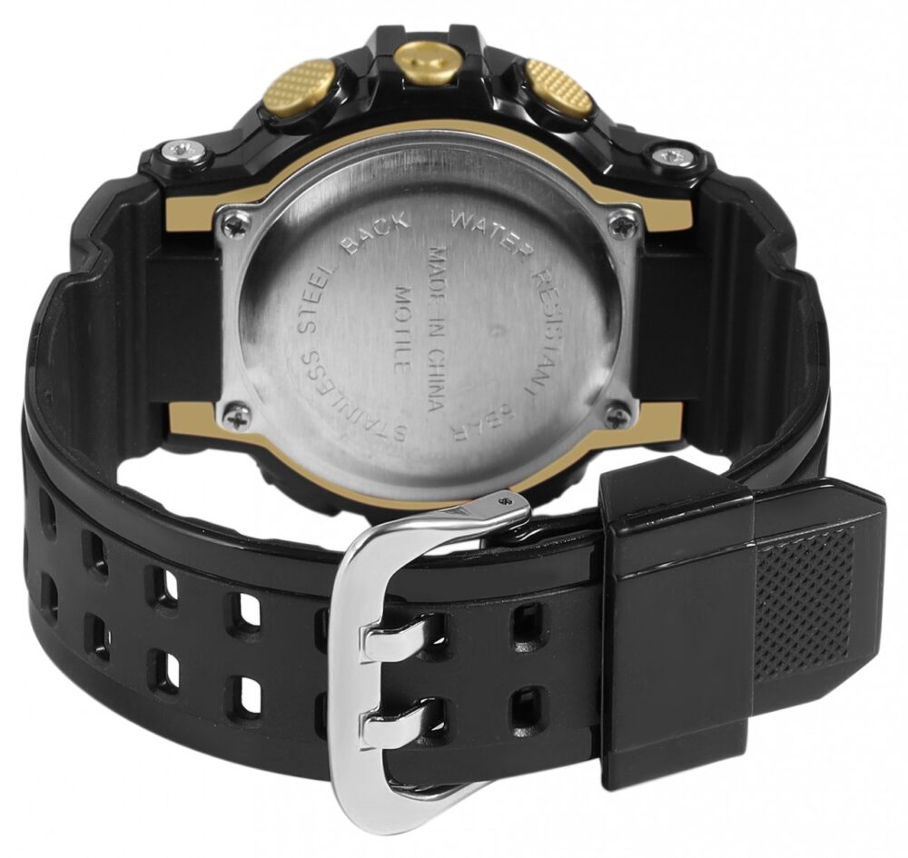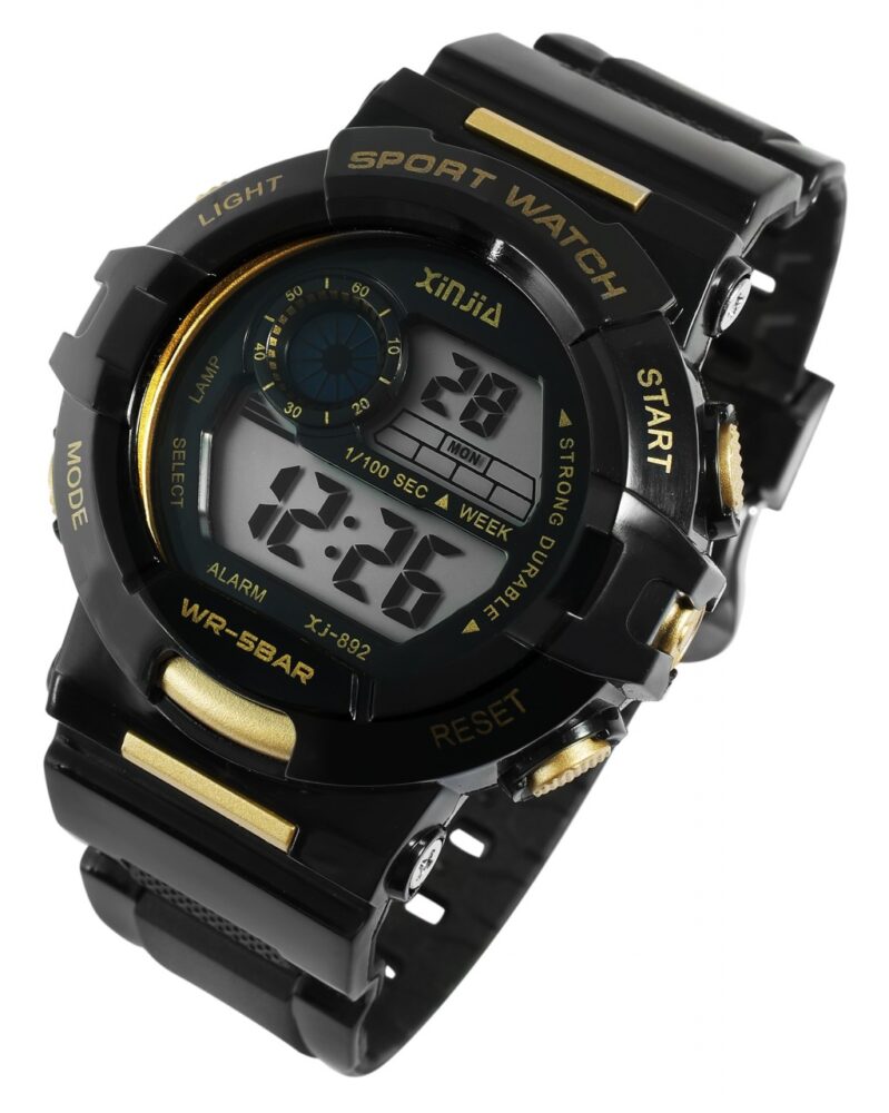 O relógio digital unissexo da marca Xinjia tem um movimento de quartzo de alta qualidade. A bracelete de silicone tem 20 mm de largura na extremidade, tem uma espessura de material de 2,5 mm e pode ser aberta e fechada com uma fivela de pino. O comprimento total do relógio é de 23 cm. A caixa de plástico com vidro de plástico mede 43 mm e tem 16,5 mm de altura. A tampa da caixa é feita de aço inoxidável. O relógio tem uma resistência à água de 5 ATM. Possui ainda as seguintes caraterísticas: indicação da data, do mês, do dia da semana, função de paragem, função de alarme e luz. Receberá um manual de instruções como acessório do…